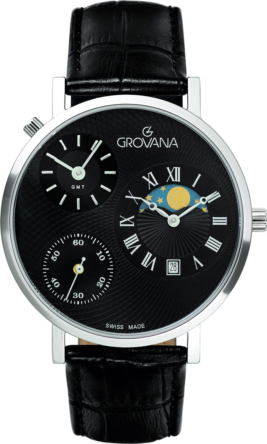 Функциональные наручные мужские часы. Круглый стальной корпус с полированной отделкой. Циферблат с узором гильоше. Два механизма. Второй часовой пояс. Секундная стрелка вынесена на отдельный циферблат.