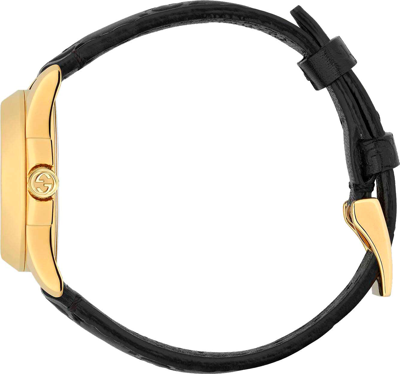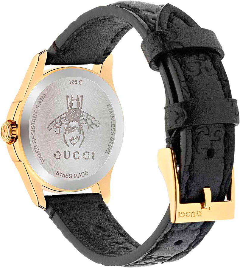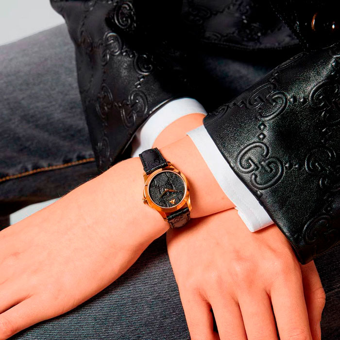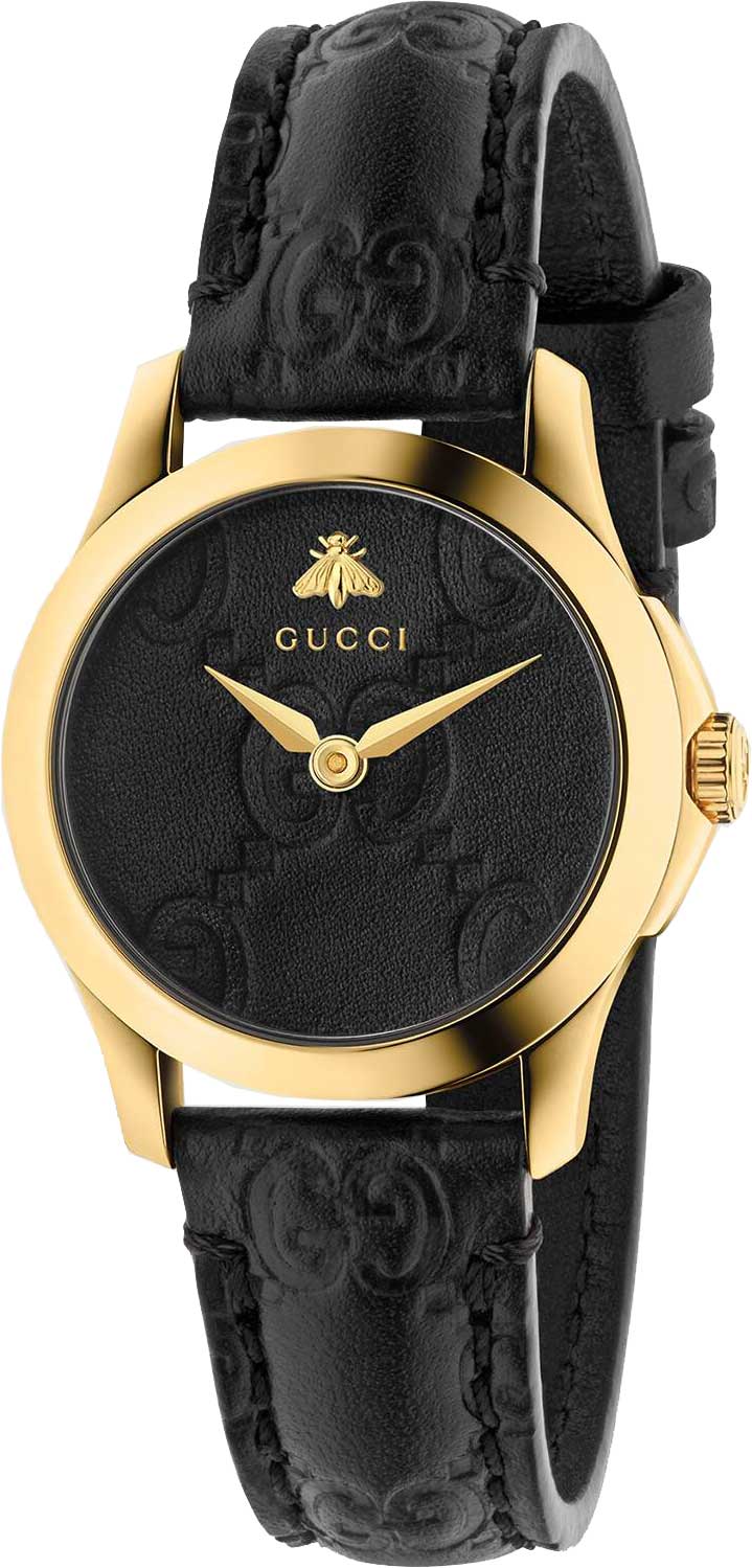 Женские кварцевые часы G-Timeless. Круглый стальной корпус. Кожаный циферблат без меток украшен узнаваемым принтом «GG» и фирменным знаком бренда - пчелой. Рифленая заводная головка с защитой. Изысканный принтованный ремешок с классической застежкой.