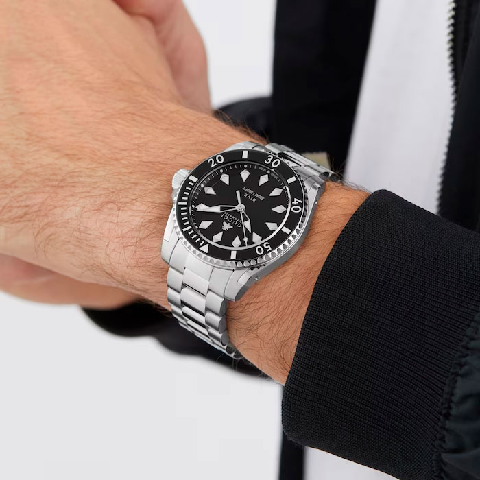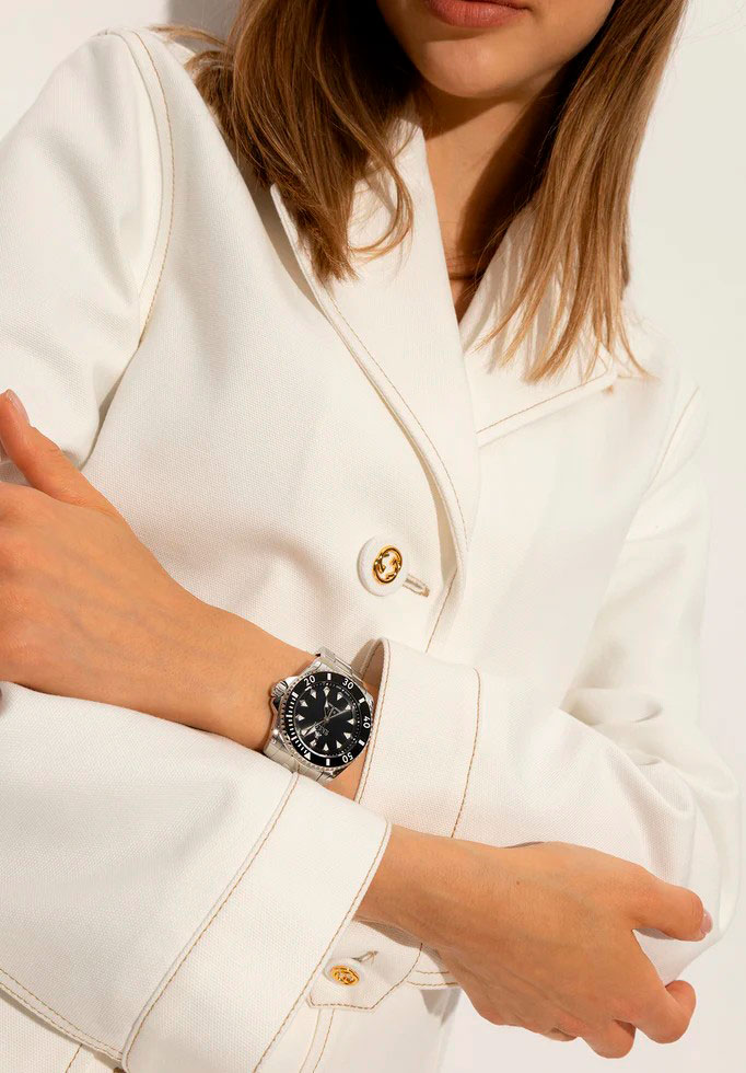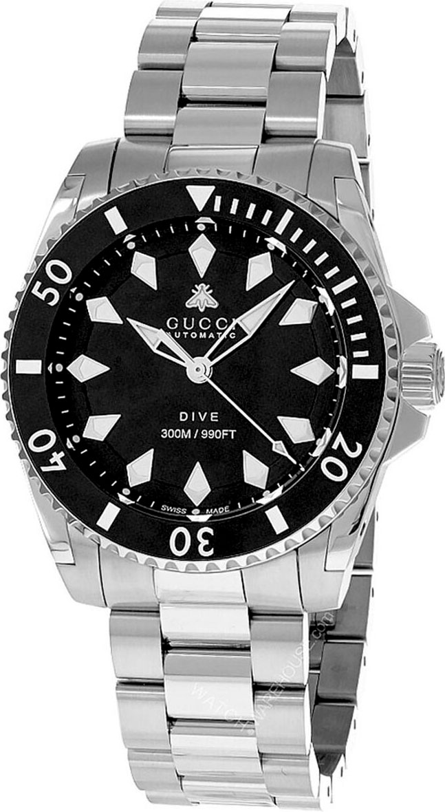 Кварцевые часы унисекс Gucci Dive. Круглый стальной корпус. Циферблат с метками в виде штрихов украшен изображением пчелы — фирменным символом модного дома. Метки и стрелки с люминесцентным покрытием SuperLuminova, которое светится в темноте после непродолжительной зарядки на свету. Рифленая заводная головка с защитой. Надежный стальной браслет с раскладывающейся застежкой.