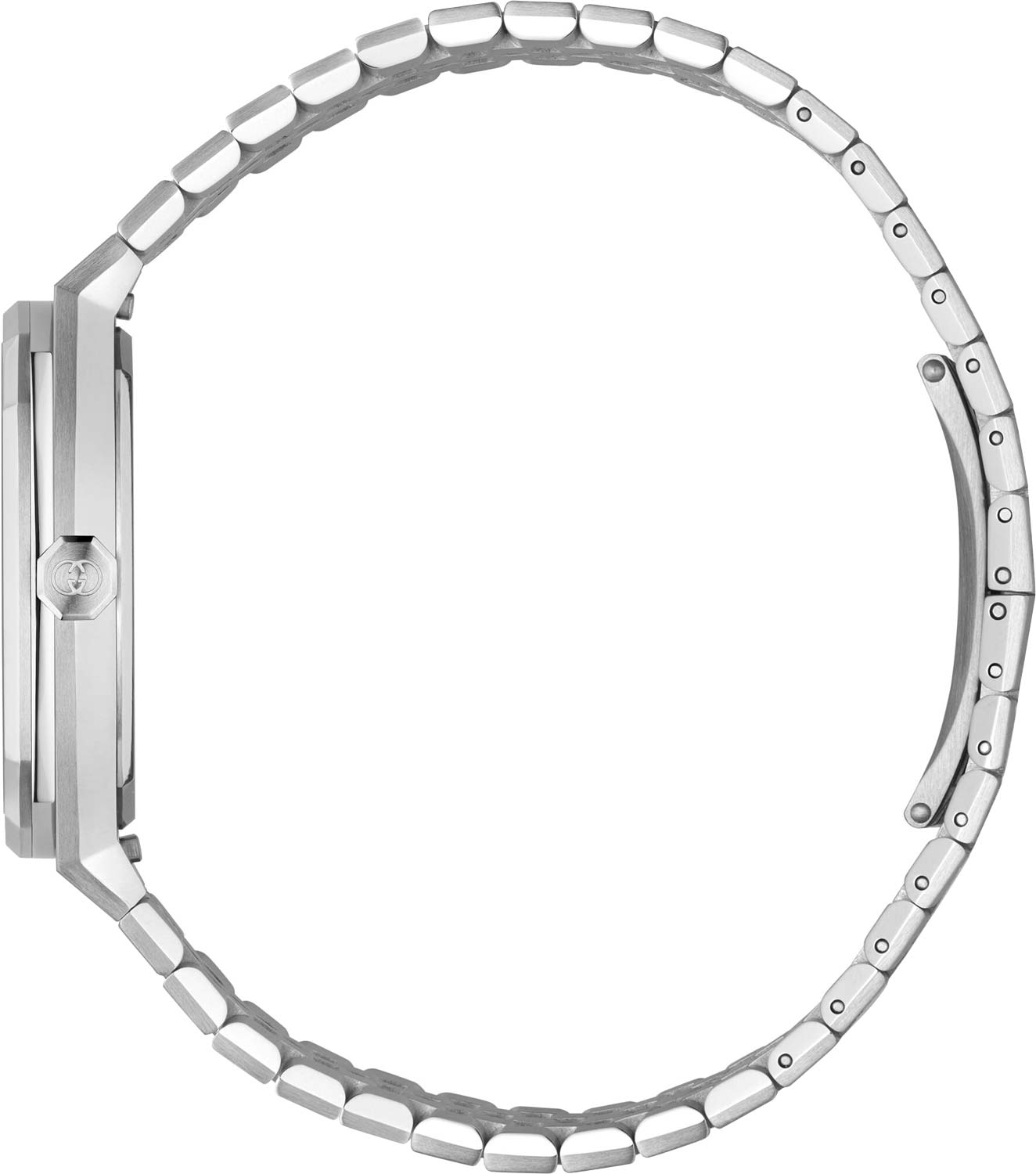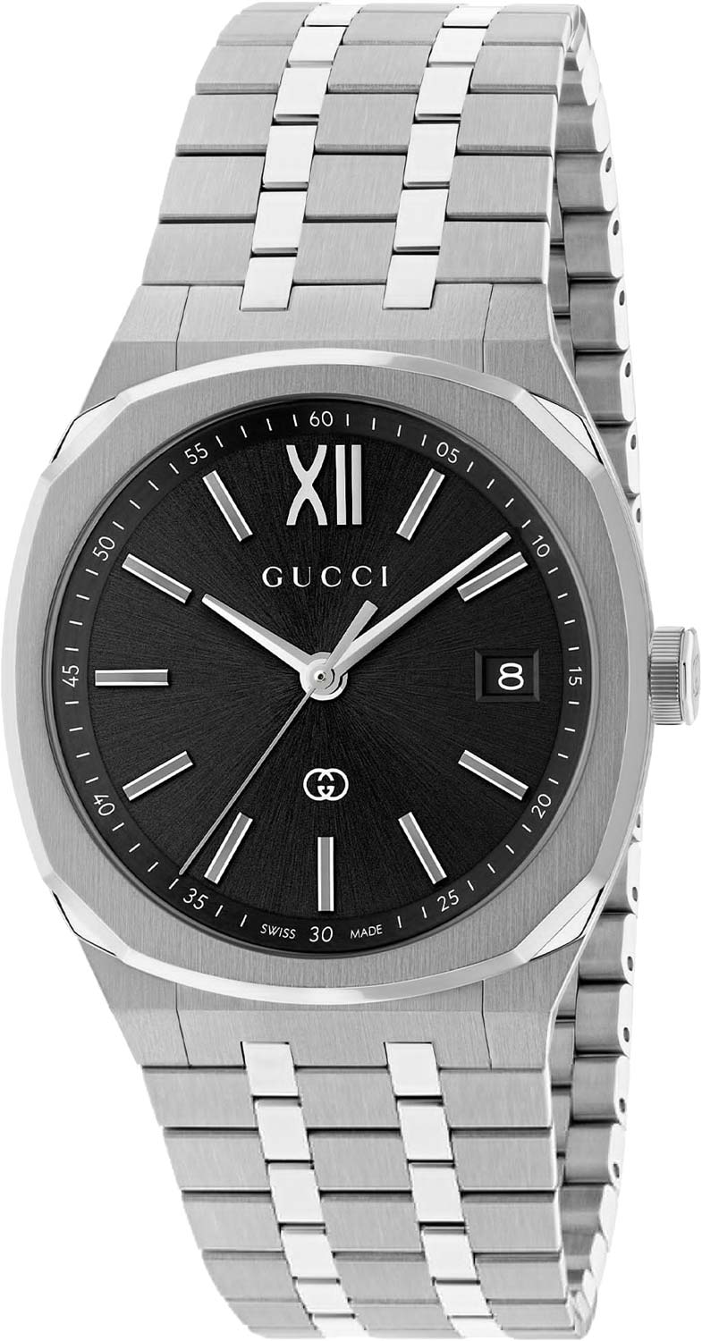 Gucci 25H. Наручные часы. Круглый стальной корпус. Циферблат с накладными метками в виде штрихов и римской цифры XII выполнен по технологии Sunray (солнечные лучи). Окошко даты находится на отметке 3 часа. Рифленая заводная головка. Задняя крышка крепится на 4-х винтах. Надежный стальной браслет с раскладывающейся застежкой.