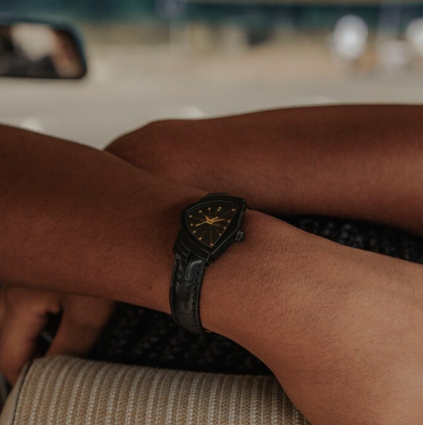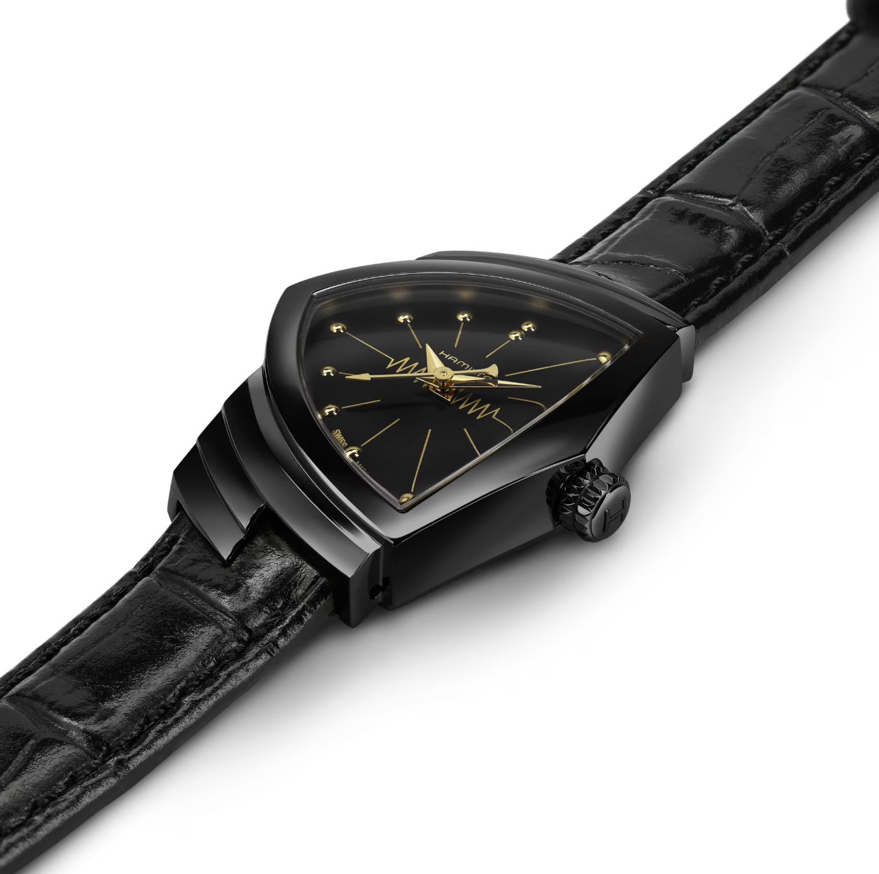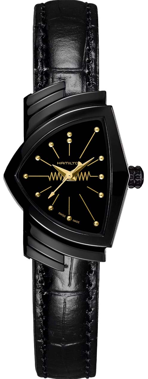 Аксессуар из серии в черных и золотых тонах, воплощающей загадочный и роскошный Голливуд. Женские кварцевые часы S Quartz. Треугольный стальной корпус. Циферблат с метками в виде штрихов и точек. Рифленая заводная головка. Кожаный ремешок с раскладывающейся застежкой.