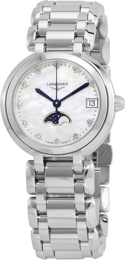 Часы с круглым стальным корпусом. Функция индикации заряда (EOL). Перламутровый циферблат защищен прочным сапфировым стеклом. Метки в виде точек, инкрустированных бриллиантами. Окошко даты находится в положении 3 часа.
