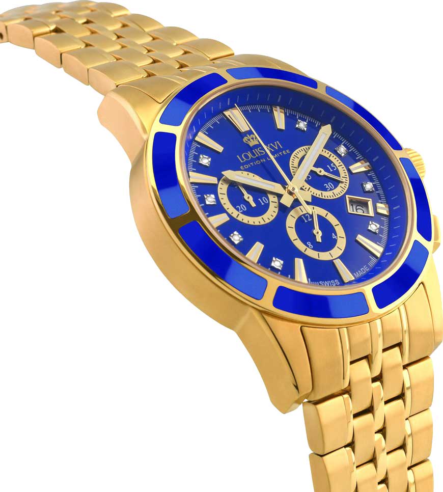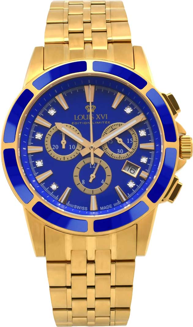 Швейцарские часы с эмалевым циферблатом прослужат вам долгие годы и всегда покажут точное время. Majeste. Лимитированная серия - 1000 экземпляров. Часы-хронограф с секундомером. Метки в виде штрихов. Окошко даты находится в положении 4 часа. Рифленая заводная головка с защитой украшена логотипом компании Louis XVI. Браслет с раскладывающейся застежкой. Застежка с системой блокировки.