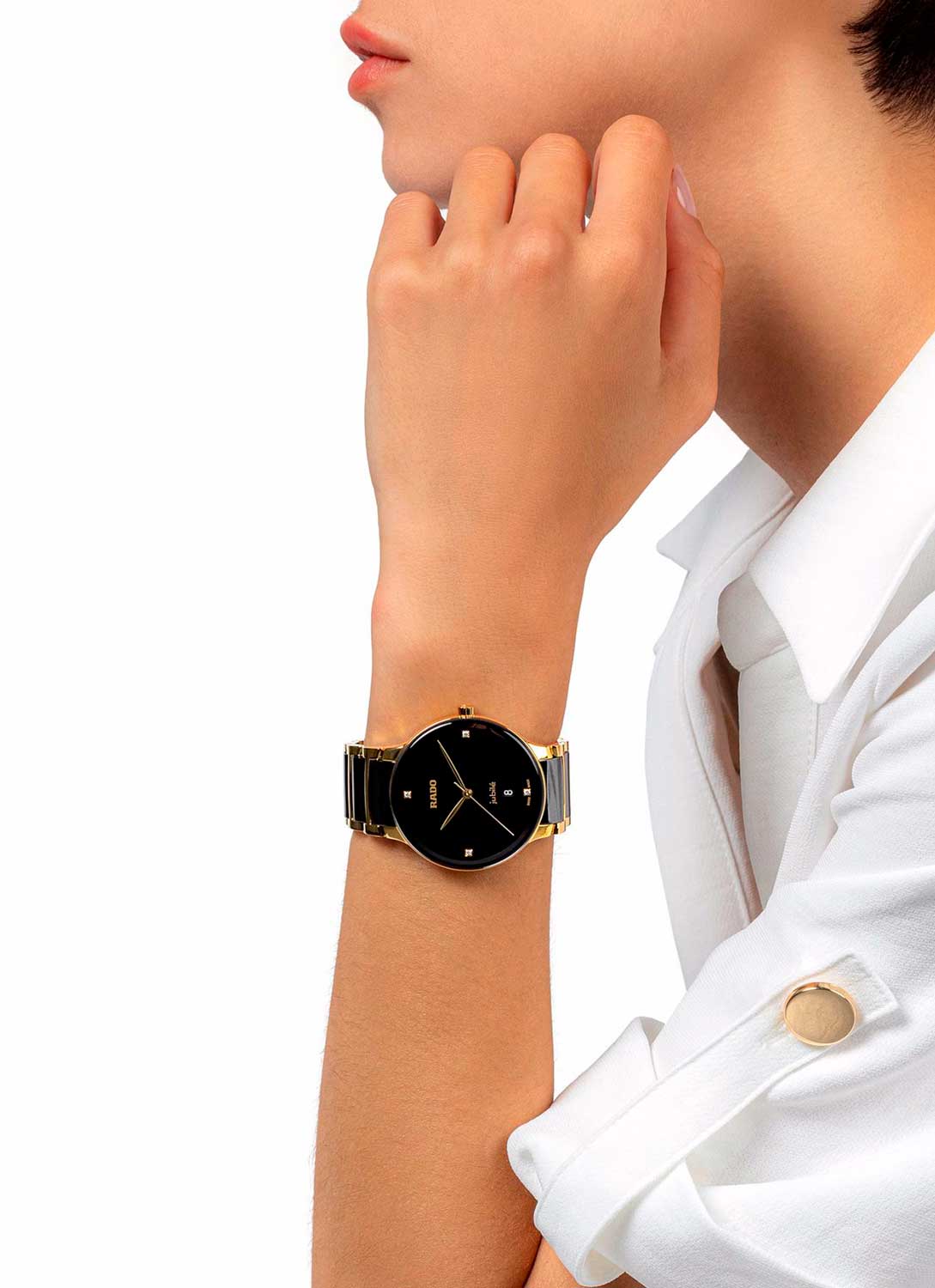 Безупречный классический стиль часов является признаком хорошего тона, который непременно оценят окружающие. Швейцарские наручные унисекс часы Centrix Diamonds. Круглый стальной корпус. Матовый циферблат украшен накладными метками с бриллиантами. Листовидные стрелки в стиле Feuille. Окошко даты находится в положении 6 часов. Рифленая заводная головка. Надежный стальной браслет с вставками из черной керамики. Раскладывающаяся застежка.