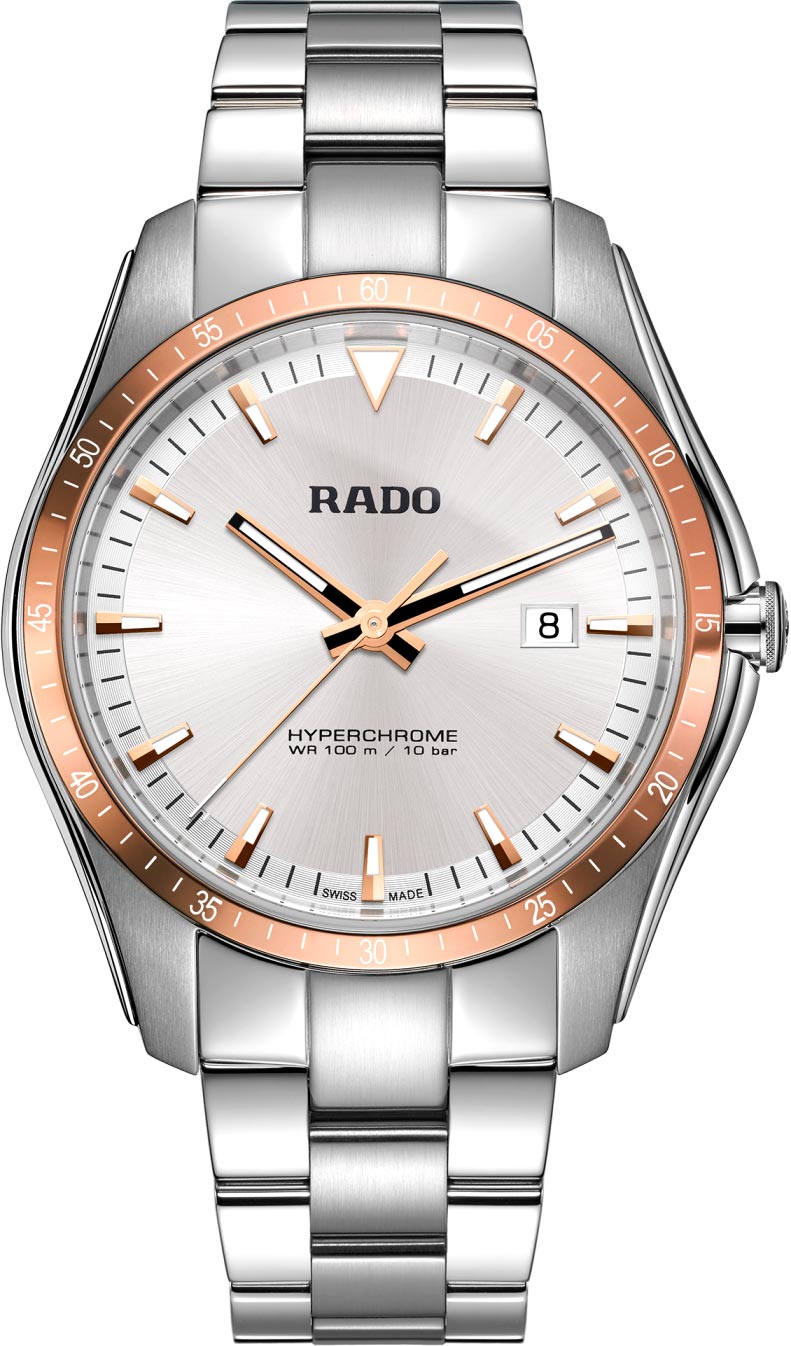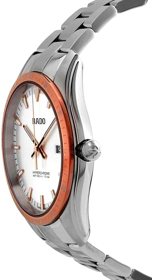 Мужские наручные часы HyperChrome. Круглый стальной корпус с матовой и полированной отделкой. Керамический безель с минутной шкалой. Циферблат выполнен по технологии Sunray (солнечные лучи). Накладные метки в виде штрихов, 12-ти часовая метка в виде треугольника.