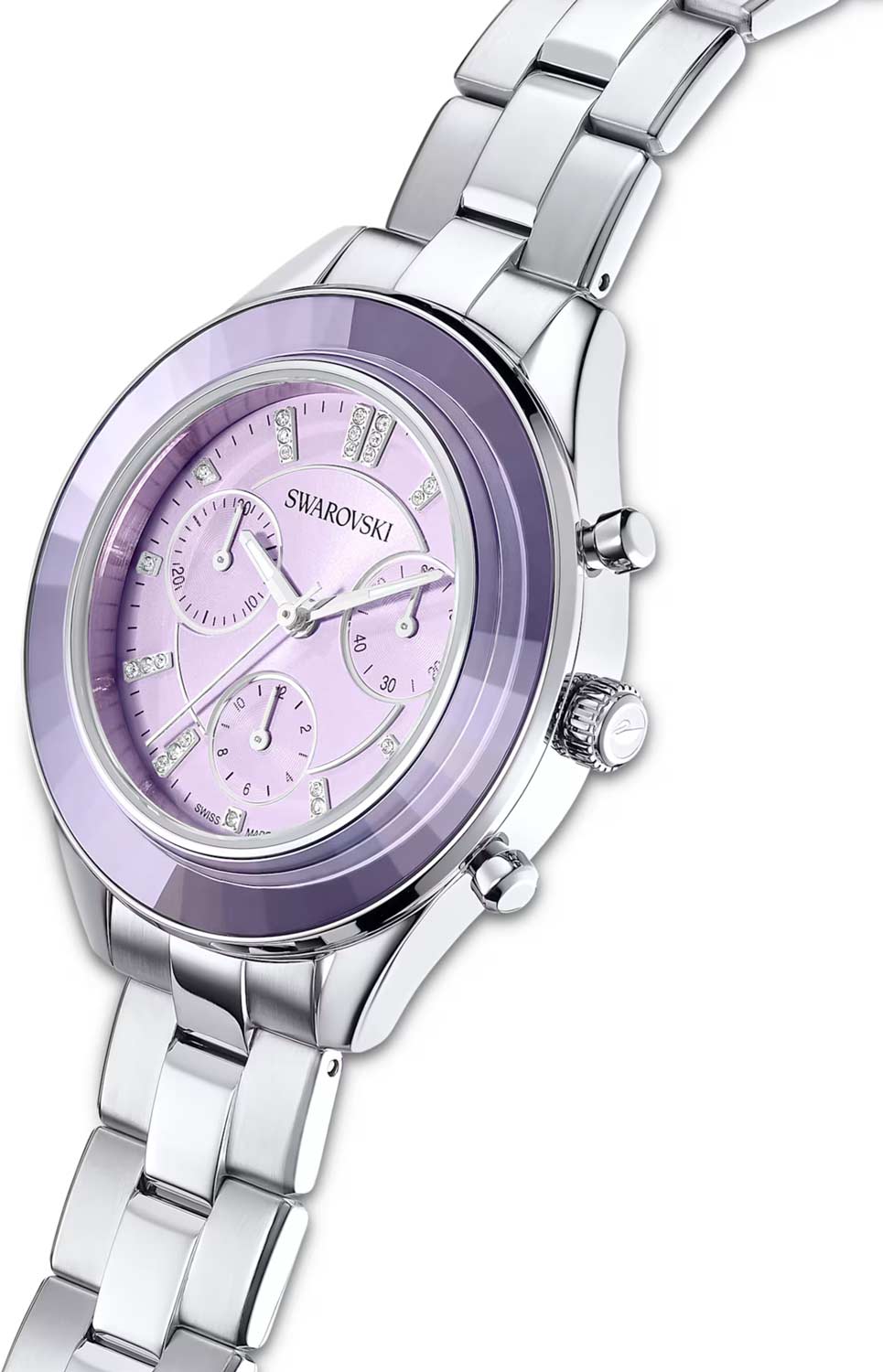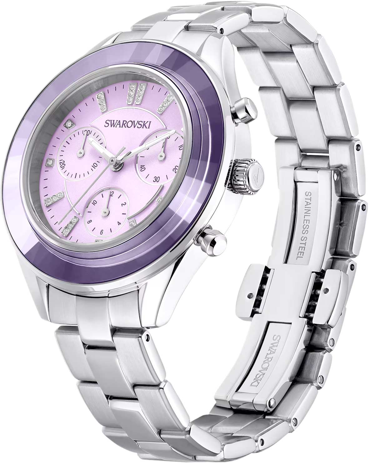 Метки в виде штрихов и точек, украшенных кристаллами Swarovski. Рифленая заводная головка. Стальной браслет с раскладывающейся застежкой.