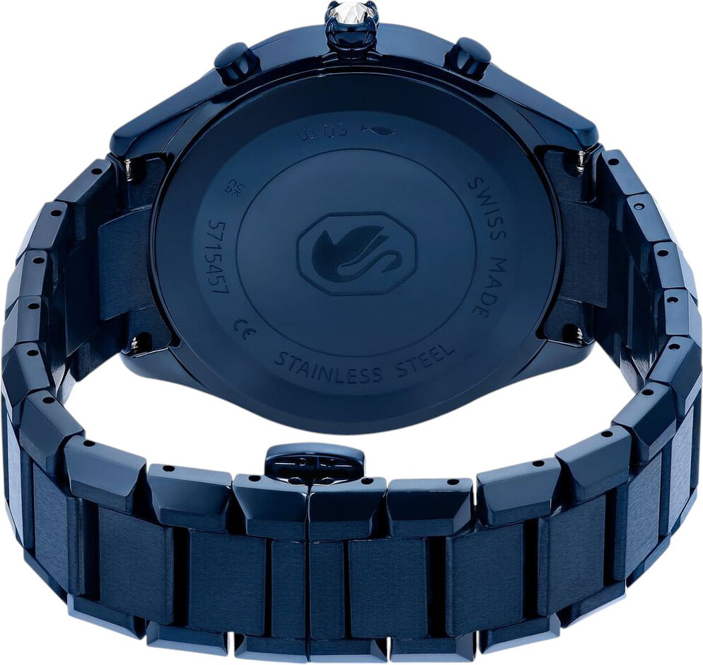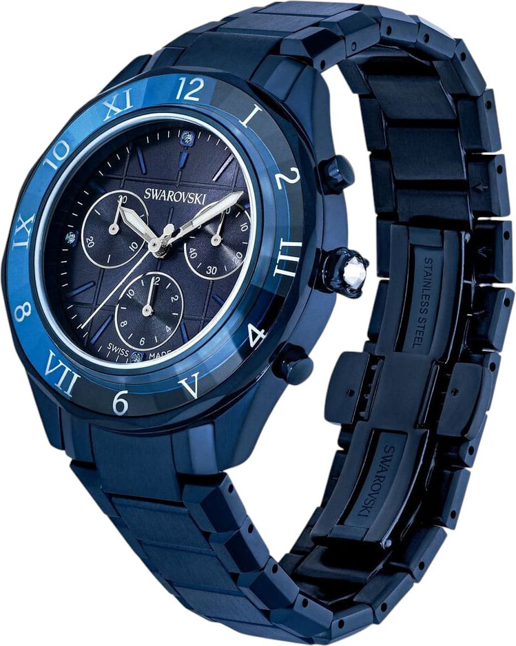 Заводная головка украшена кристаллом круглой огранки. Стальной браслет с синим PVD покрытием и застежкой-бабочкой.