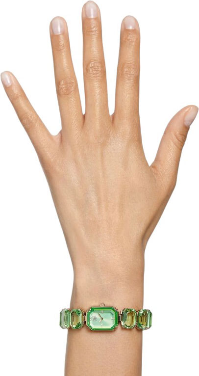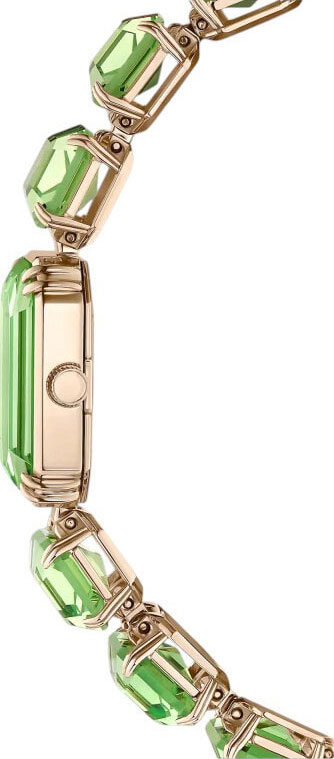 Женские кварцевые часы Millenia. Стальной восьмиугольный корпус с кристальным безелем. Зеленый циферблат с логотипом Swarovski в виде лебедя в положении 12 часов и метками в виде точек из кристаллов в положениях 3, 6 и 9 часов. Мечевидные стрелки в стиле Sword. Секундная стрелка отсутствует.