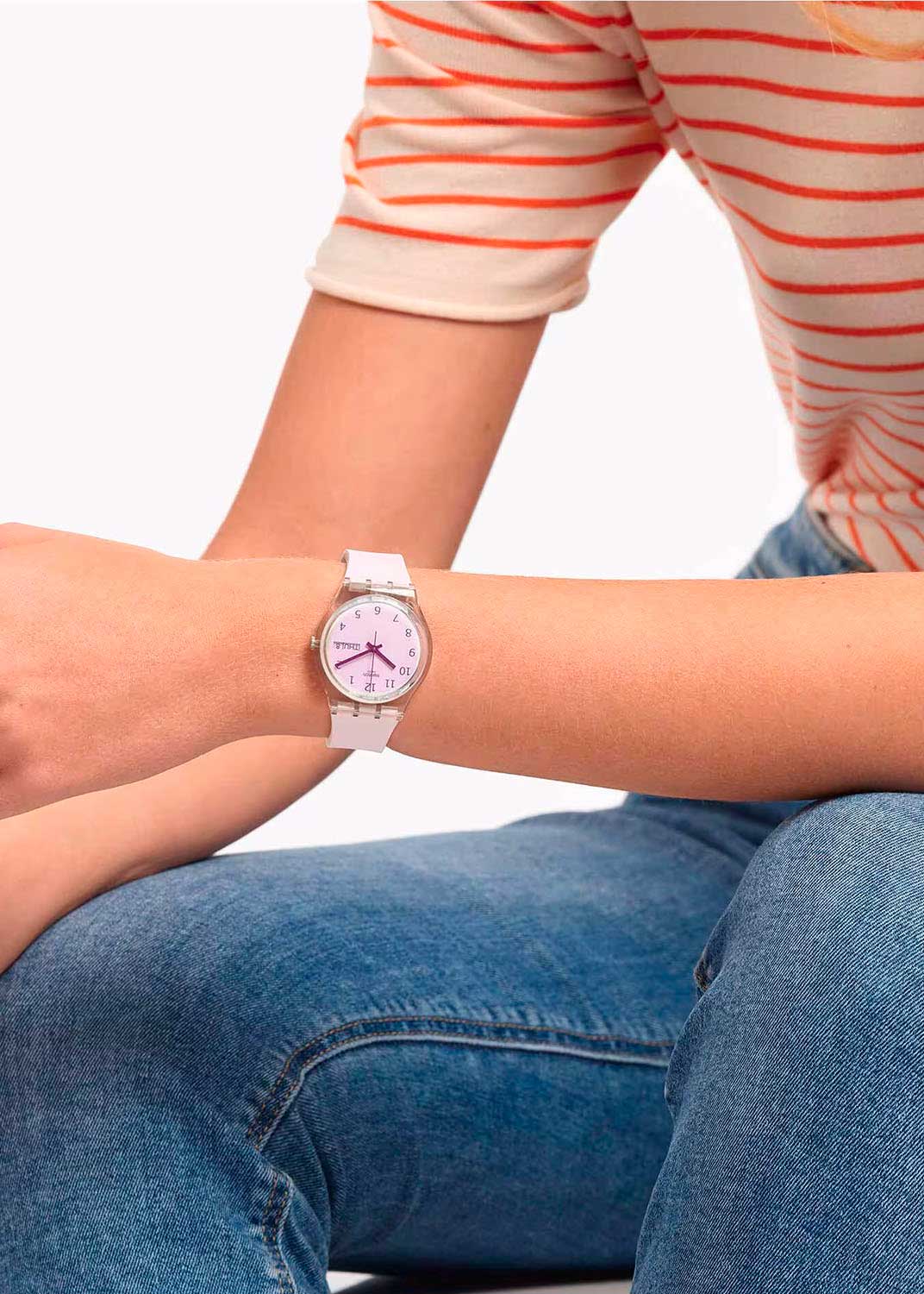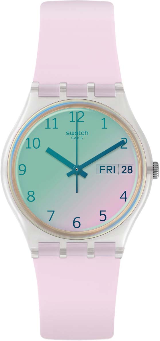 Женские наручные часы Ultrarose. Круглый матовый корпус из прозрачного пластика. Матовый циферблат. Метки в виде арабских цифр. Окошко даты и дня недели в положении 3 часа. Прямоугольные стрелки в стиле Baton. Стекло из многослойного цветного акрила Swatch Solar Spectrum. Рифленая заводная головка. Силиконовый ремешок с классической полимерной застежкой.