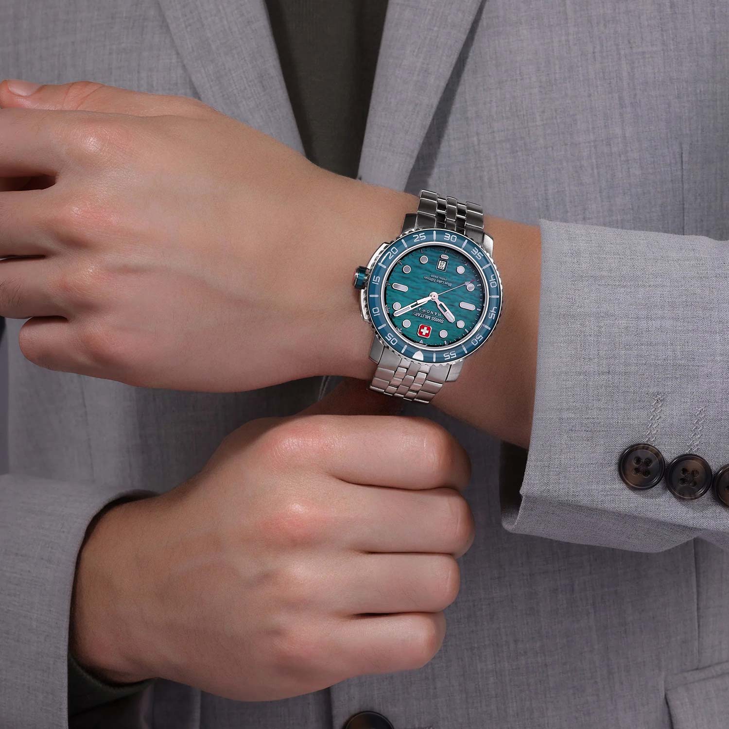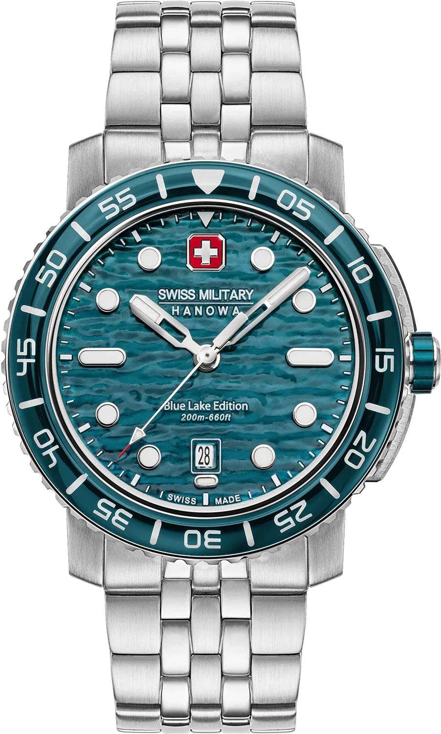 Мужские дайверские часы Swiss Blue Lake из серии Glorifying Swissness (Прославляя Швейцарию) – это шедевр технических инноваций и захватывающего дизайна, вдохновленный завораживающими глубинами озера Блаузее в Швейцарии. Отличительной особенностью модели является изогнутое сапфировое стекло, которое обеспечивает непревзойденную прозрачность и устойчивость к царапинам, а водонепроницаемость 20 АТМ позволит уверенно покорять глубины. Полупрозрачный циферблат, изготовленный с использованием уникального процесса гидравлической штамповки и отделанный лаком, вызывает в памяти переливающиеся зеленые и синие оттенки вод Блаузее. Вращающийся в одном направлении рифленый безель с минутной шкалой. Ударопрочное верхнее кольцо из минерального стекла K1 для дополнительной защиты. Стрелки с люминесцентным покрытием, которое светится в темноте после непродолжительной зарядки на свету. Окошко даты находится в положении 6 часов. Завинчивающаяся заводная головка с защитой. Надежный стальной браслет с раскладывающейся застежкой. Застежка с системой блокировки.