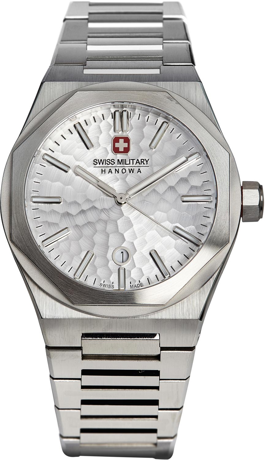 Мужские наручные часы Octon Hammered. Круглый стальной корпус с матовой и полированной отделкой. Безель с 8-ми угольной накладкой. Циферблат с декоративным узором дополнен фирменным логотипом Swiss Military Hanowa. Накладные метки в виде штрихов. Прямоугольные стрелки в стиле Baton. Метки и стрелки с люминесцентным покрытием, которое светится в темноте после непродолжительной зарядки на свету. Окошко даты находится в положении 6 часов. Заводная головка украшена фирменным логотипом. Стальной браслет с раскладывающейся застежкой.