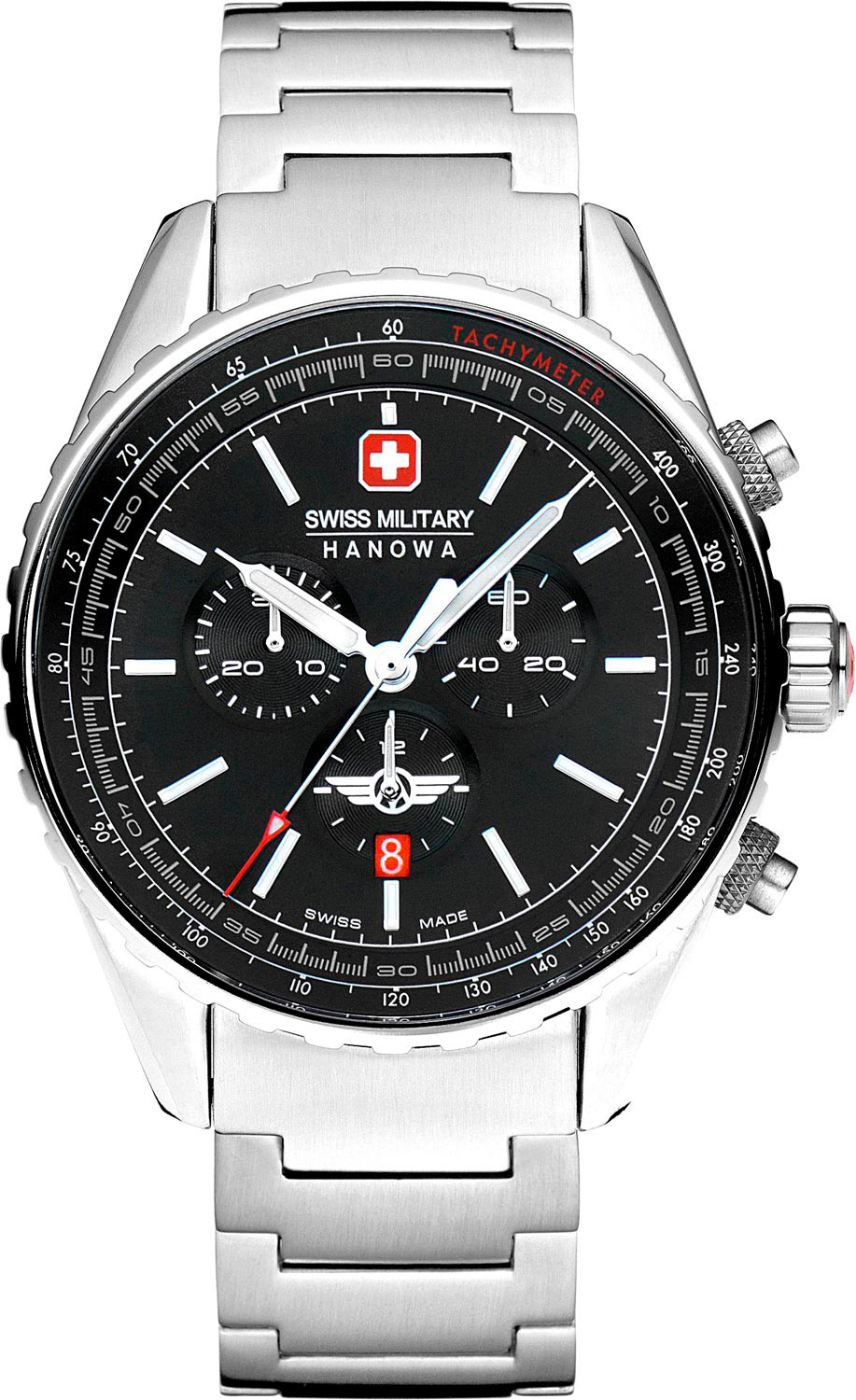 Эти стильные часы для энергичных и уверенных в себе ''пилотов'', которые стремятся преуспеть в жизни. Наручные мужские часы Afterburn Chrono. Часы-хронограф с секундомером и тахиметром. Классический круглый стальной корпус. Циферблат выполнен по технологии Sunray (солнечные лучи). Украшен оригинальной иконкой AIR в положении 6 часов и фирменным логотипом Swiss Military Hanowa в положении 12 часов. Метки в виде штрихов. Стрелки и метки с люминесцентным покрытием, которое светится в темноте после непродолжительной зарядки на свету. Окошко даты находится в положении 6 часов. Рифленая заводная головка украшена фирменным логотипом. Стальной браслет с раскладывающейся застежкой.