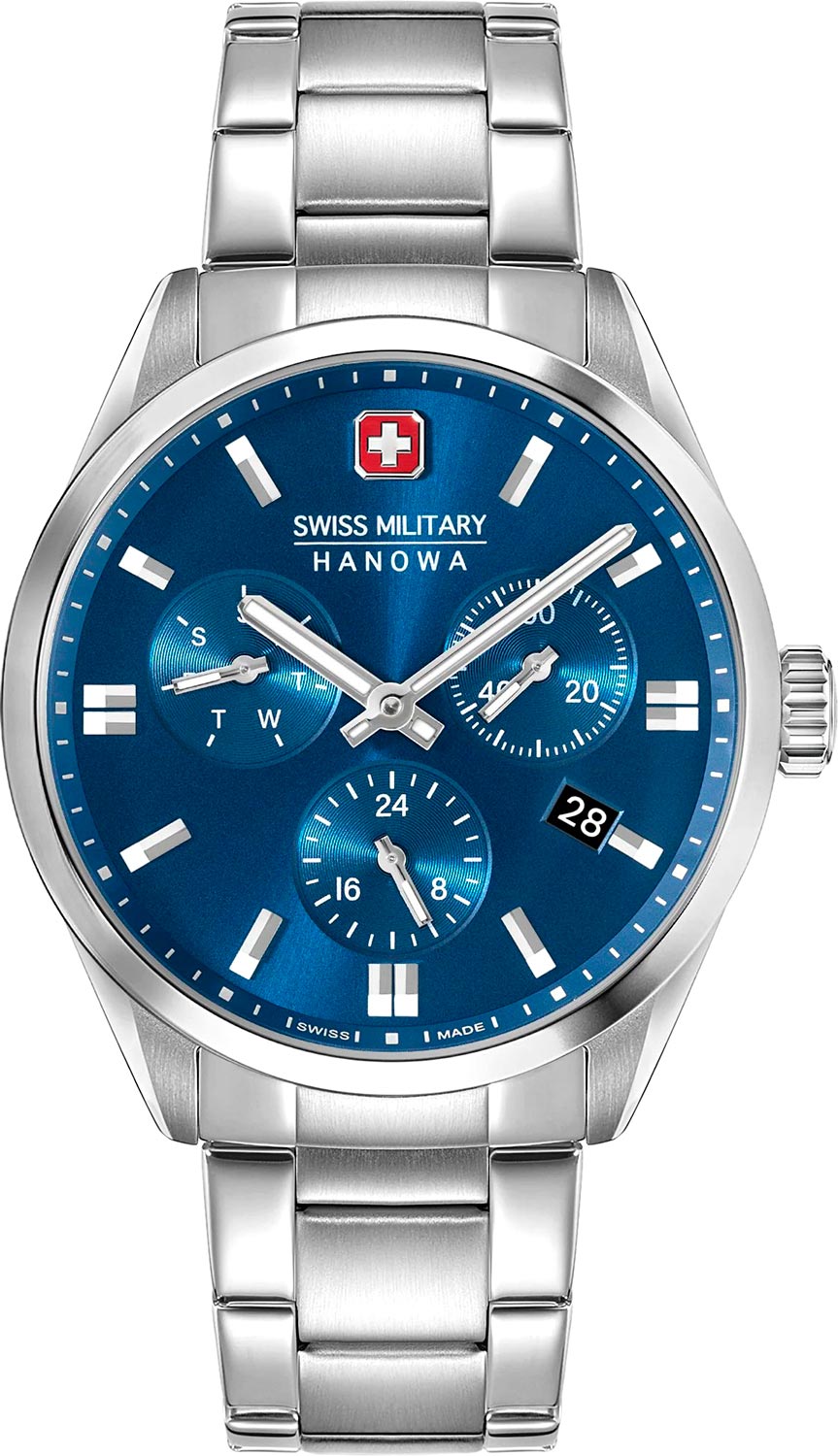 Функциональные мужские наручные часы Roadrunner Advanced. 12-ти и 24-х часовой формат времени. Секундная стрелка вынесена на отдельный циферблат. Круглый стальной корпус с матовой и полированной отделкой. Циферблат выполнен по технологии Sunray (солнечные лучи) и дополнен фирменным логотипом Swiss Military Hanowa. Накладные метки в виде штрихов. Прямоугольные стрелки в стиле Baton. Метки и стрелки с люминесцентным покрытием, которое светится в темноте после непродолжительной зарядки на свету. Окошко даты находится в положении 4 часа. Рифленая заводная головка украшена фирменным логотипом. Завинчивающаяся задняя крышка. Стальной браслет с раскладывающейся застежкой.