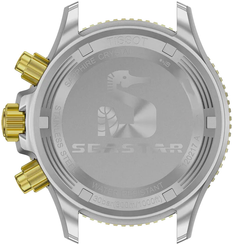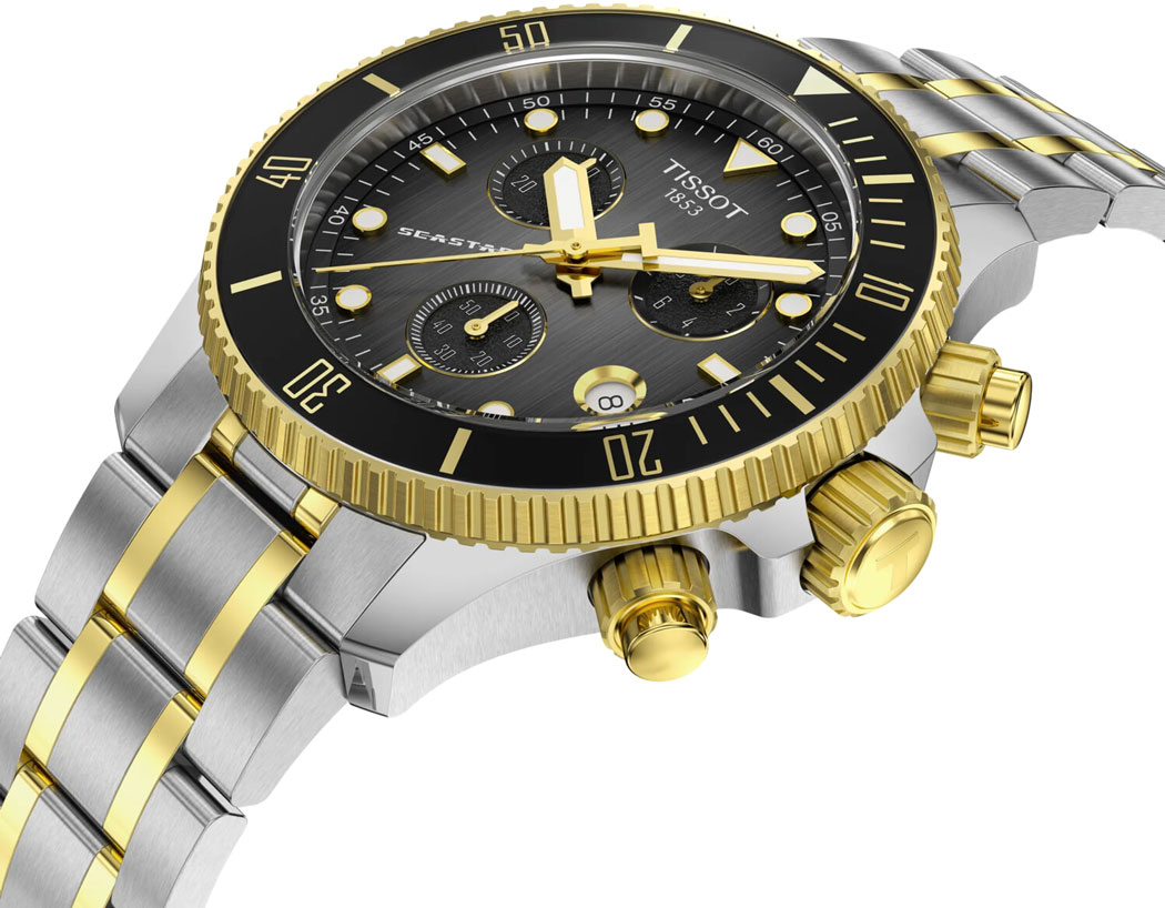 Мужские наручные часы-хронограф с секундомером T-Sport Seastar 1000. Функция индикации заряда (EOL). Режимы ADD и SPLIT. Счетчик на 30 минут и 1/10 секунды. Круглый стальной корпус. Рифленый вращающийся в одном направлении безель. Градиентный серо-черный циферблат защищен сапфировым стеклом с двусторонним антибликовым покрытием.