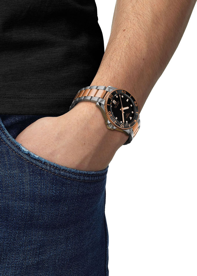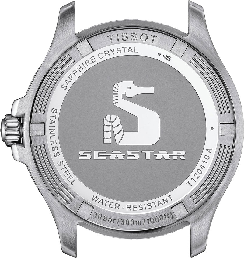 Мужские наручные часы T-Sport Seastar 1000. В механизме 3 камня. Круглый стальной корпус. Рифленый вращающийся в одном направлении безель. Циферблат защищен сапфировым стеклом с двусторонним антибликовым покрытием. Метки в виде точек и штрихов. Метки и стрелки с люминесцентным покрытием, которое светится в темноте после непродолжительной зарядки на свету. Окошко даты находится в положении 6 часов.