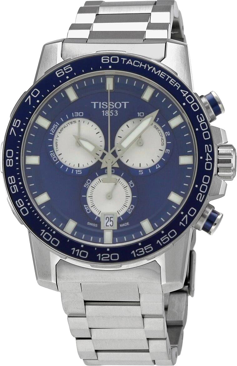Этот хронограф, работающий на базе кварцевого механизма, является квинтэссенцией современного спортивного стиля. Индексы позволяют лучше видеть время и добавляют глубину циферблату. Tissot Supersport Chrono - это мужественная, динамичная и футуристическая коллекция, которая предлагает широкий спектр референций, давая каждому возможность выбрать часы, которые лучше всего подходят к его запястью. Мужские часы-хронограф с секундомером и тахиметром T-Sport Supersport Chrono. В механизме 4 камня. Функция индикации заряда (EOL). Круглый стальной корпус. Алюминиевый безель с тахиметрической шкалой. Заостренные прямоугольные стрелки в стиле Baton. Метки в виде штрихов. Метки и стрелки с люминесцентным покрытием, которое светится в темноте после непродолжительной зарядки на свету. Окошко даты находится в положении 6 часов. Рифленая заводная головка с защитой. Надежный стальной браслет с раскладывающейся застежкой, системой быстрой замены и удлинением для дайверов. Застежка с системой блокировки.