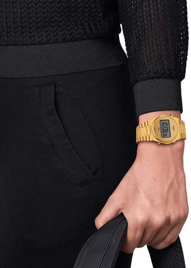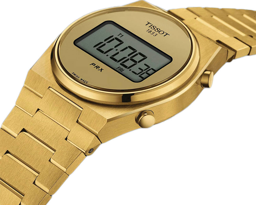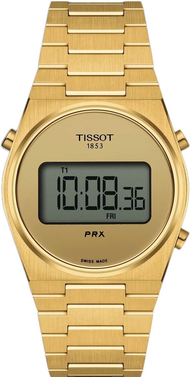 Часы-хронограф в ретро-стиле PRX Digital. Унисекс. 12-ти и 24-х часовой формат времени. Второй часовой пояс. Индикатор даты и дня недели. Функция индикации заряда (EOL). Стальной браслет с раскладывающейся застежкой и системой быстрой замены.