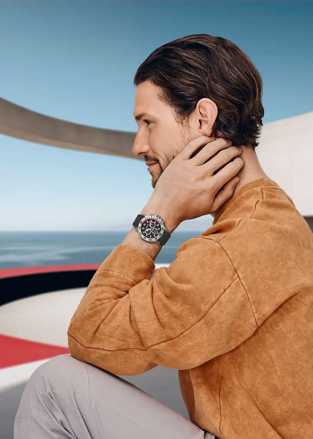 Мужские часы-хронограф с секундомером Seaforce Chrono. Круглый стальной корпус. Безель вращается в одном направлении. Циферблат с метками в виде штрихов. Окошко даты находится в положении 6 часов. Завинчивающаяся рифленая заводная головка с защитой. Завинчивающаяся задняя крышка. Силиконовый ремешок с классической застежкой.