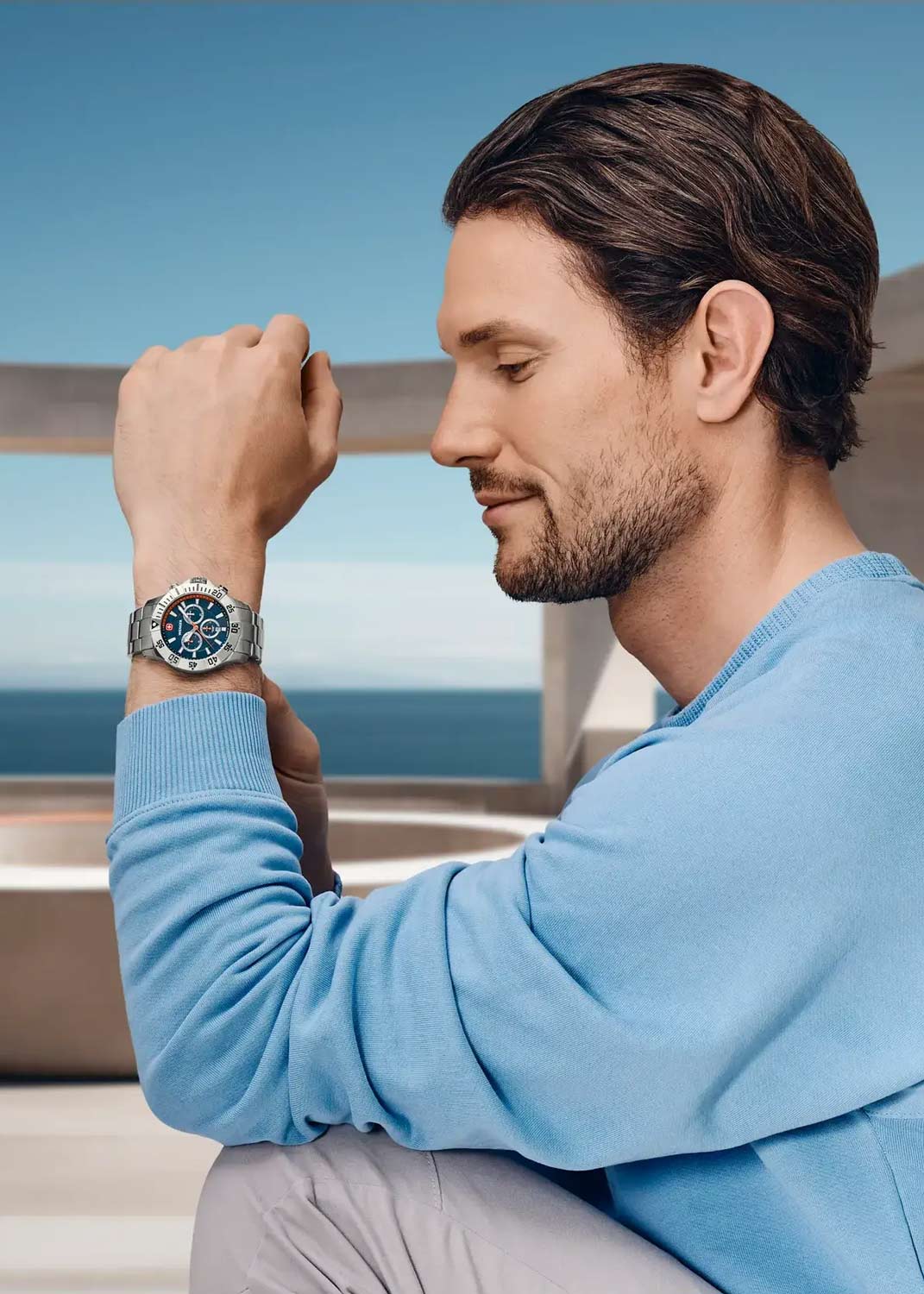 Мужские часы-хронограф с секундомером Seaforce Chrono. Круглый стальной корпус. Безель вращается в одном направлении. Циферблат с метками в виде штрихов. Окошко даты находится в положении 6 часов. Завинчивающаяся рифленая заводная головка с защитой. Завинчивающаяся задняя крышка. Браслет с раскладывающейся застежкой. Застежка с системой блокировки.