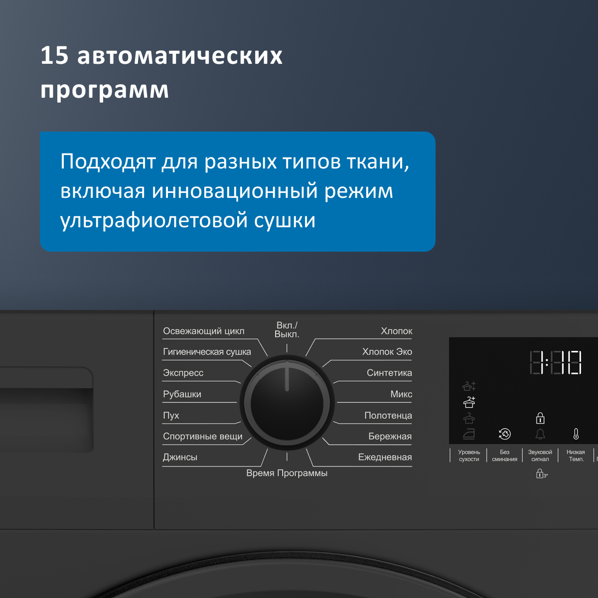 - ПрограммыХлопок/Сушка В шкаф; Освежающая для шерсти; микс; верхняя одежда; гигиена; джинсы; пуховые изделия; рубашки; синтетика сушка в шкаф; синтетика сушка под утюг; спортивная; хлопок в шкаф; хлопок сушка под утюг; хлопок экстра; экспресс 14