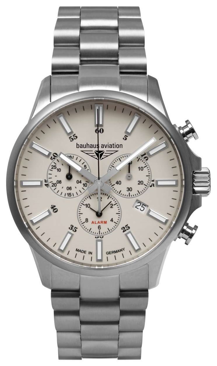 Этот аксессуар станет незаменимым помощником не только для пилотов, но и для любителей активного образа жизни. Мужские наручные часы-хронограф с секундомером и будильником. Круглый титановый корпус. Прямоугольные стрелки в стиле Baton и весь циферблат с люминесцентным покрытием, которое светится в темноте после непродолжительной зарядки на свету. Метки в виде штрихов. Окошко даты находится в положении 4 часа. Титановый браслет.