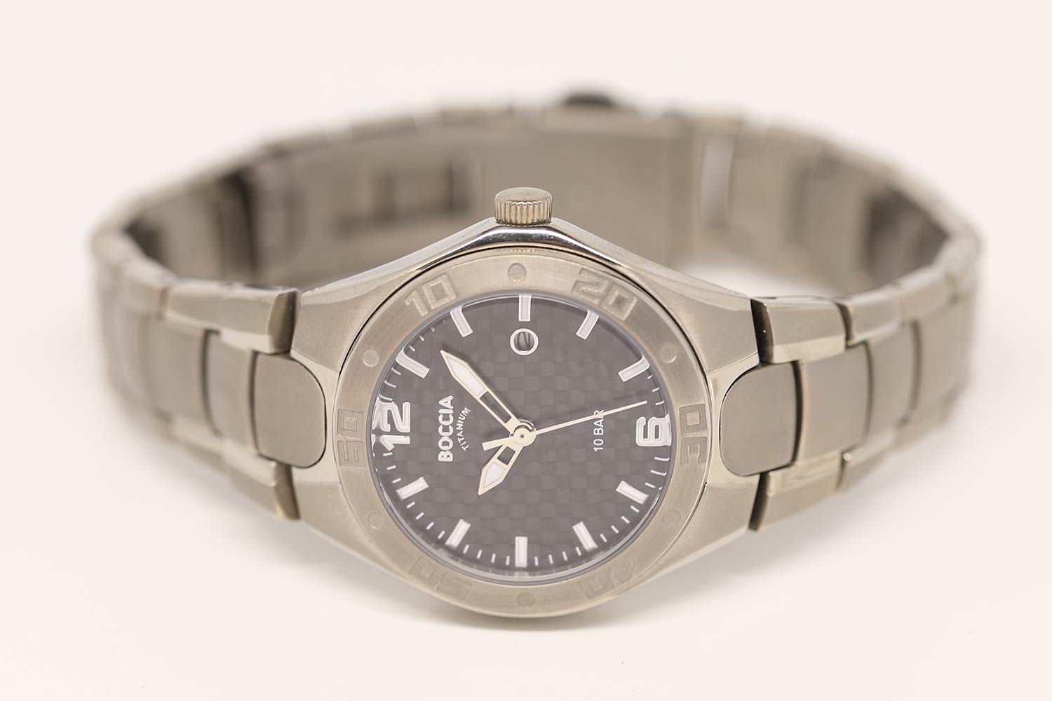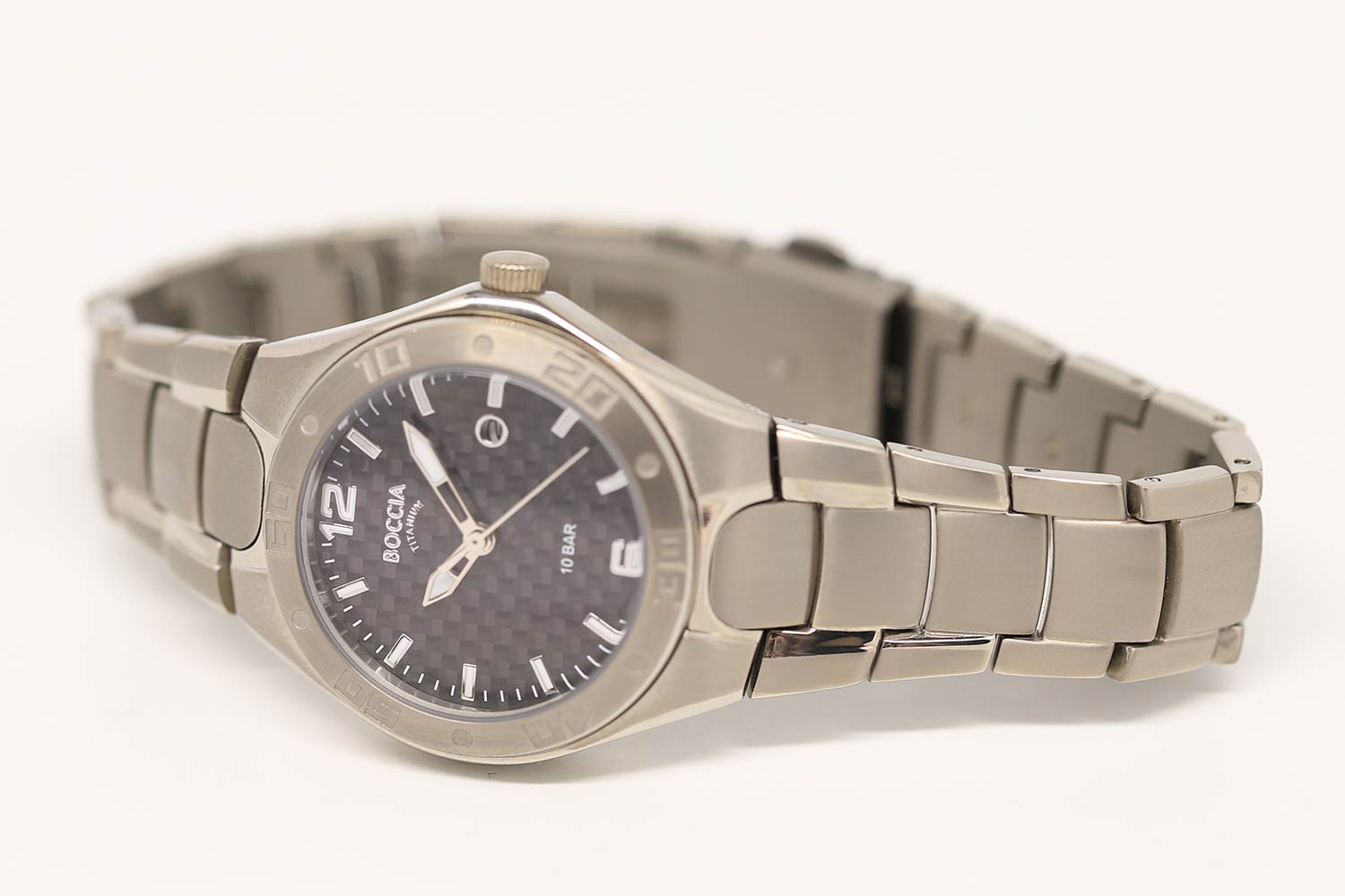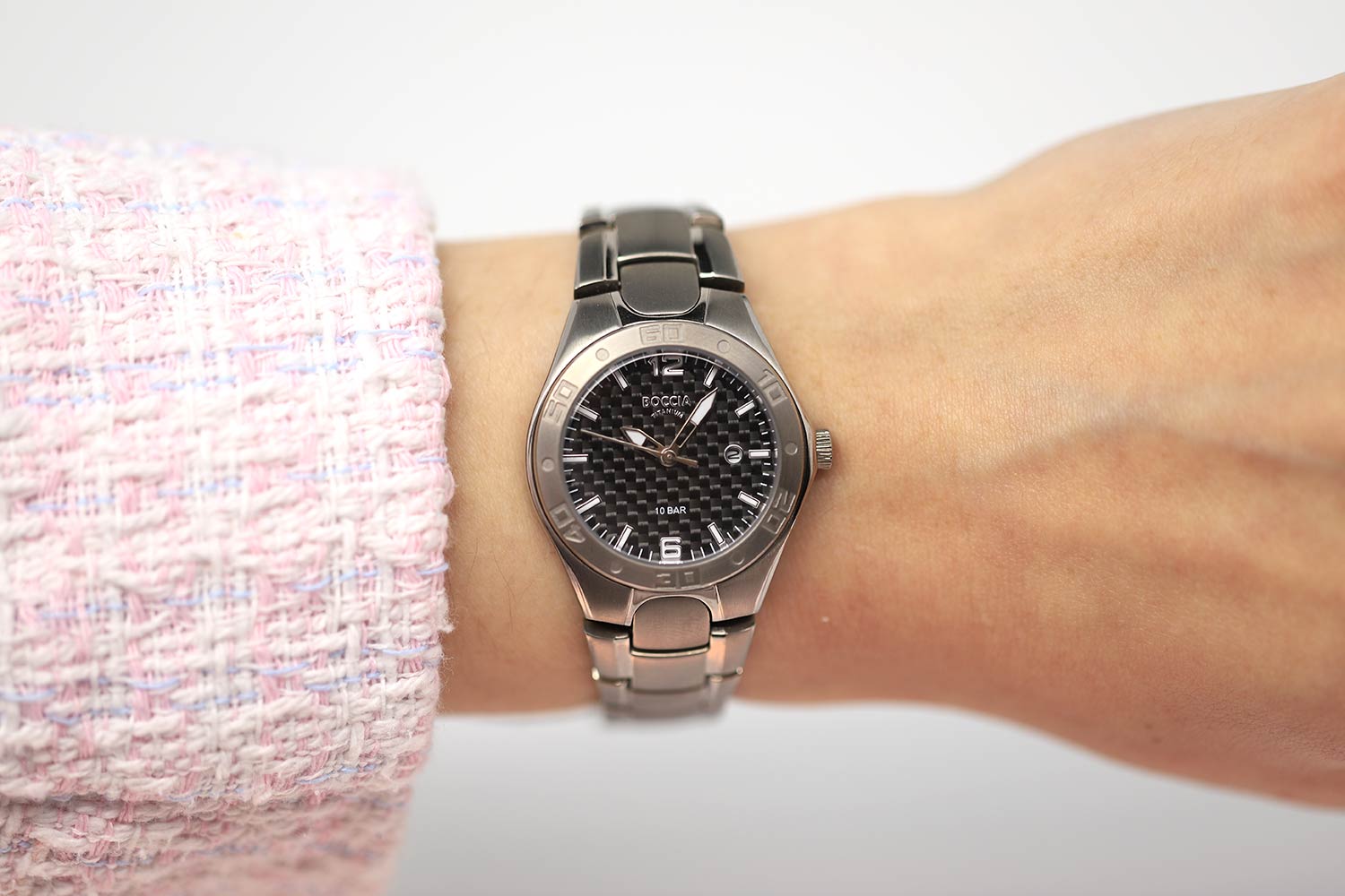 Элегантный аксессуар со сдержанным простым дизайном никогда не выйдет из моды и всегда будет актуален. Женские наручные часы. Круглый корпус из титана. Карбоновый циферблат с метками в виде штрихов и арабских цифр 6 и 12. Окошко даты находится в положении 3 часа. Рифленая заводная головка. Браслет с раскладывающейся застежкой.