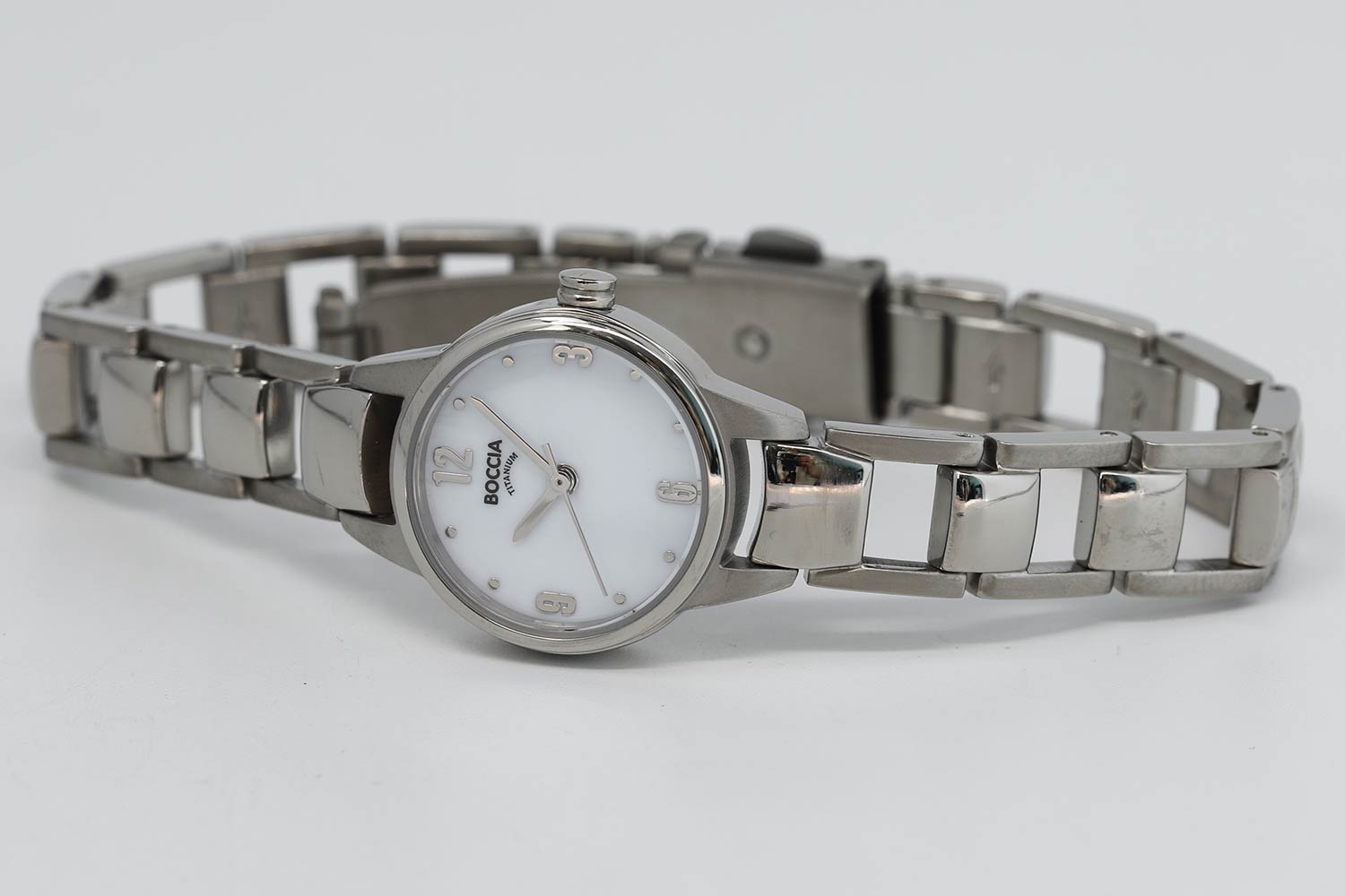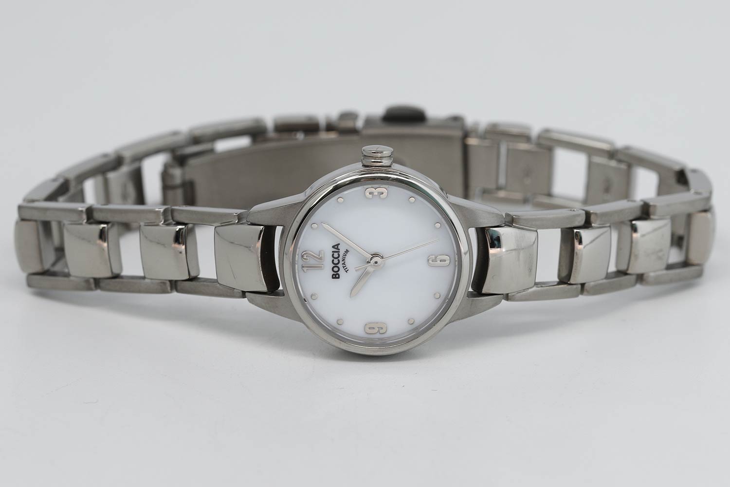 Аккуратный аксессуар с симпатичным дизайном добавит вашему образу нежности и изысканности. Ультратонкие. Женские часы с круглым корпусом из титана. Перламутровый циферблат с метками в виде точек и арабских цифр. Браслет с раскладывающейся застежкой.