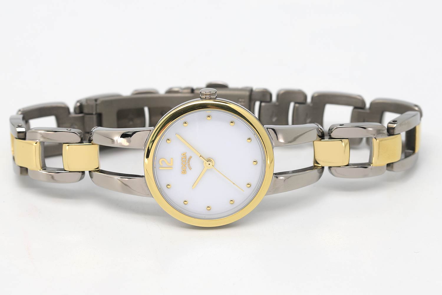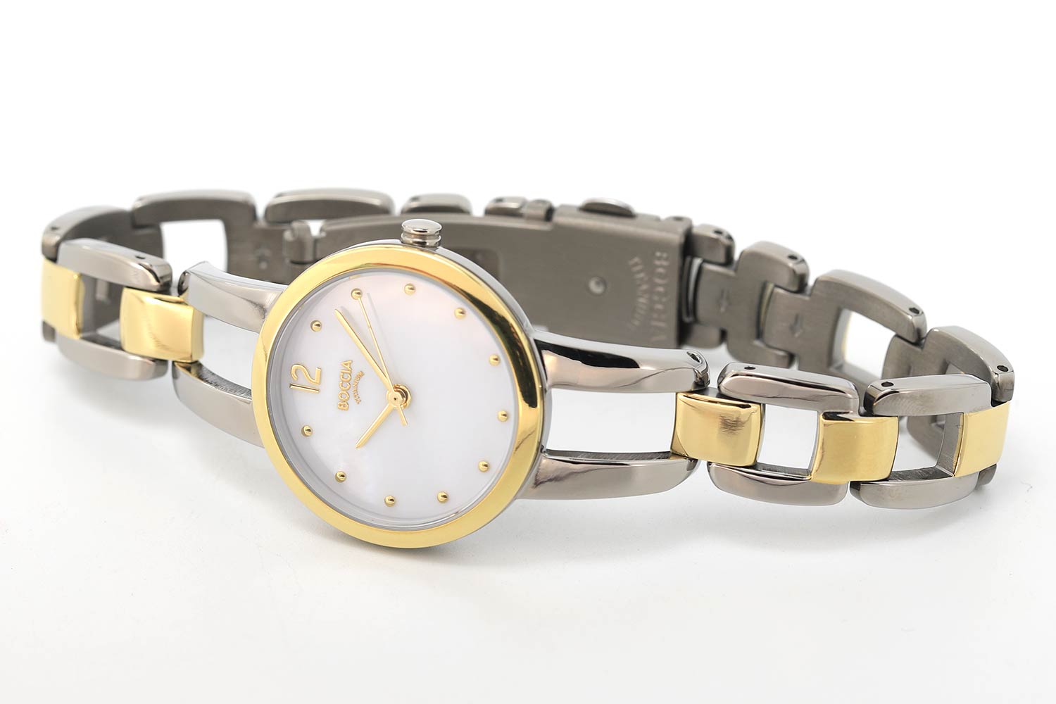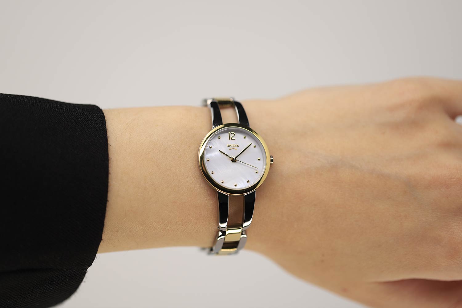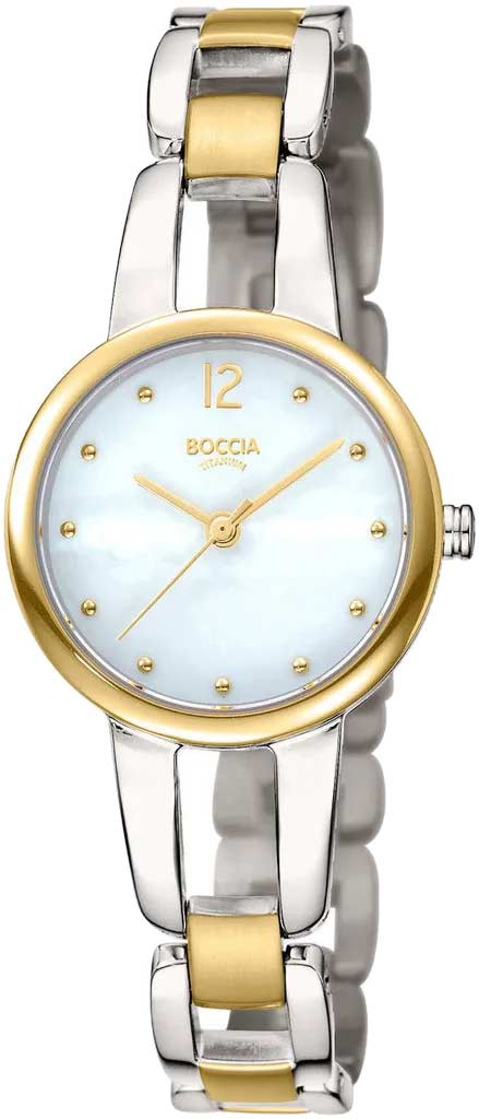 Элегантность, точность, плавные линии - идеальный аксессуар для настоящей леди. Женские часы с круглым титановым корпусом. Перламутровый циферблат с метками в виде точек и арабской цифры 12. Удобный браслет с раскладывающейся застежкой.