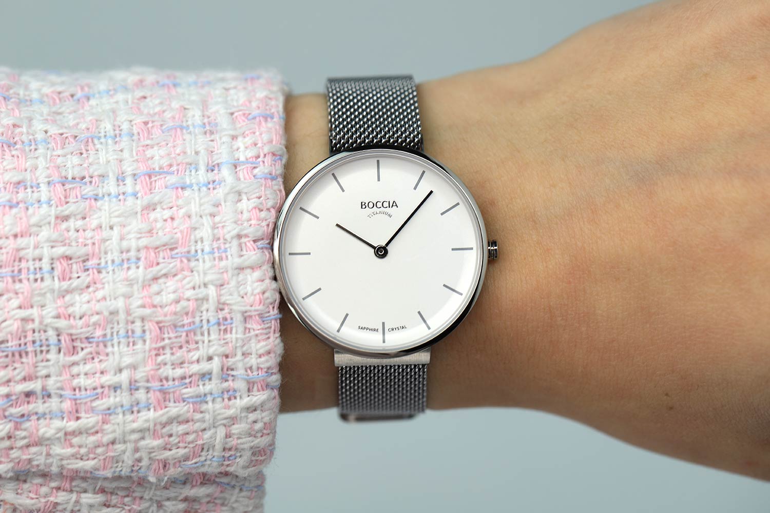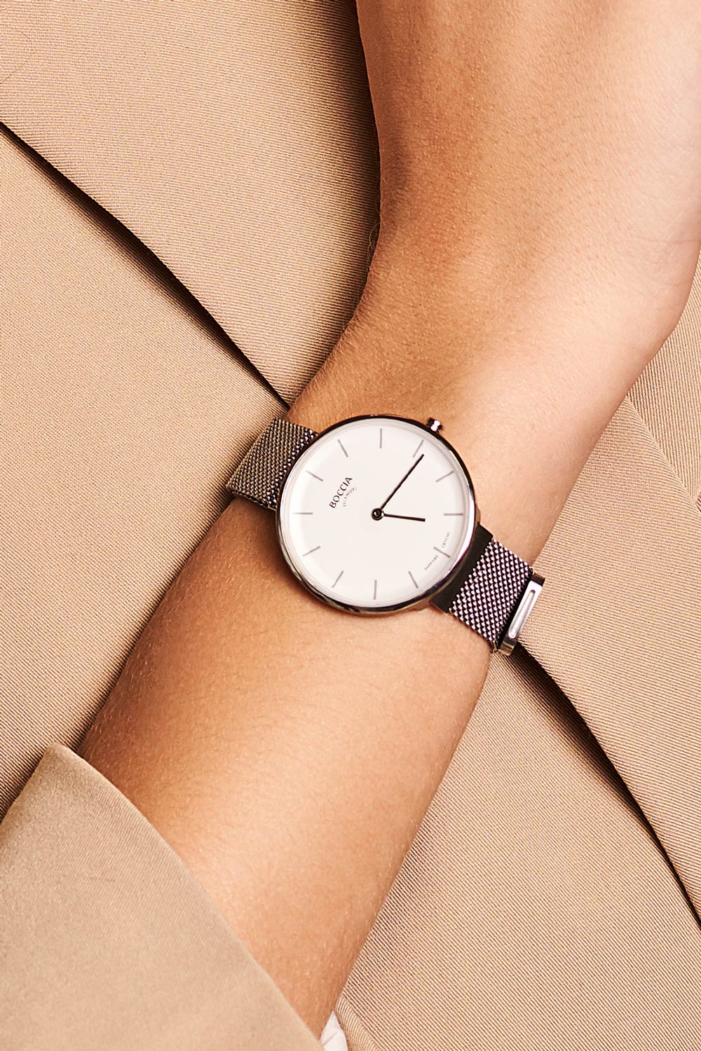 Часы, созданные с заботой об окружающей среде, станут вашим верным спутником. Женские наручные часы с круглым корпусом. Метки в виде штрихов. Браслет миланского плетения.