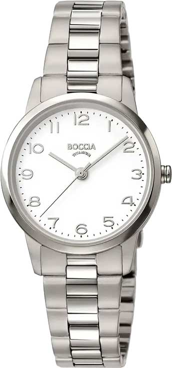 Женские наручные часы. Круглый корпус из титана. Циферблат с метками в виде арабских цифр. Титановый браслет с раскладывающейся застежкой.