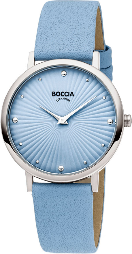 Женские часы с круглым корпусом из титана. Циферблат с метками в виде точек защищен минеральным стеклом. Кожаный ремешок с классической застежкой.