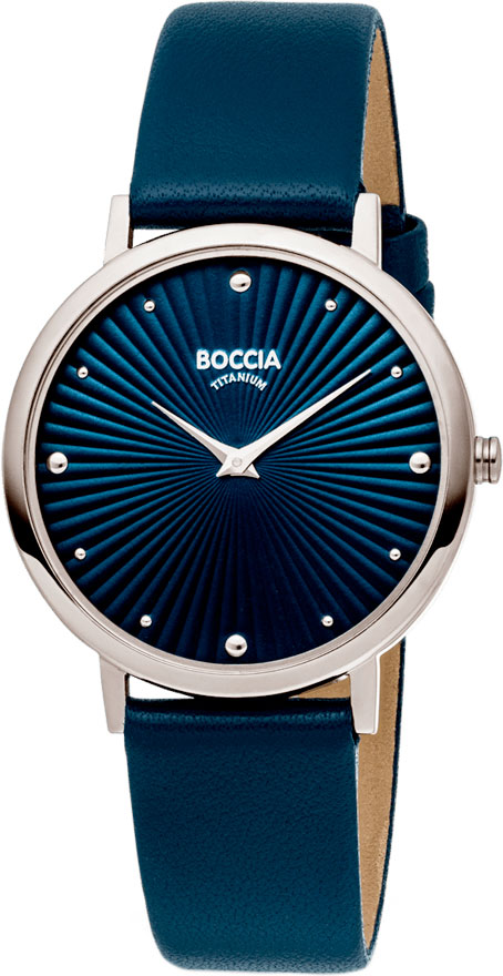 Женские часы с круглым корпусом из титана. Циферблат с метками в виде точек защищен минеральным стеклом. Кожаный ремешок с классической застежкой.