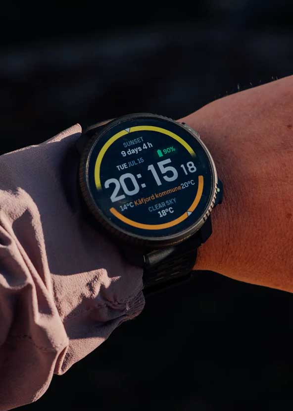 Цветной сенсорный AMOLED циферблат 1,5‘’ с разрешением 466x466. Настраиваемые экраны и подсветка. Дополнительные функции: второй часовой пояс, секундомер, SPLIT-хронограф, таймер, будильник, время восхода/захода солнца, автоматический переход на зимнее и летнее время. Датчики: барометрический альтиметр, электронный компас, термометр, пульсоксиметр (показывает уровень кислорода в крови).