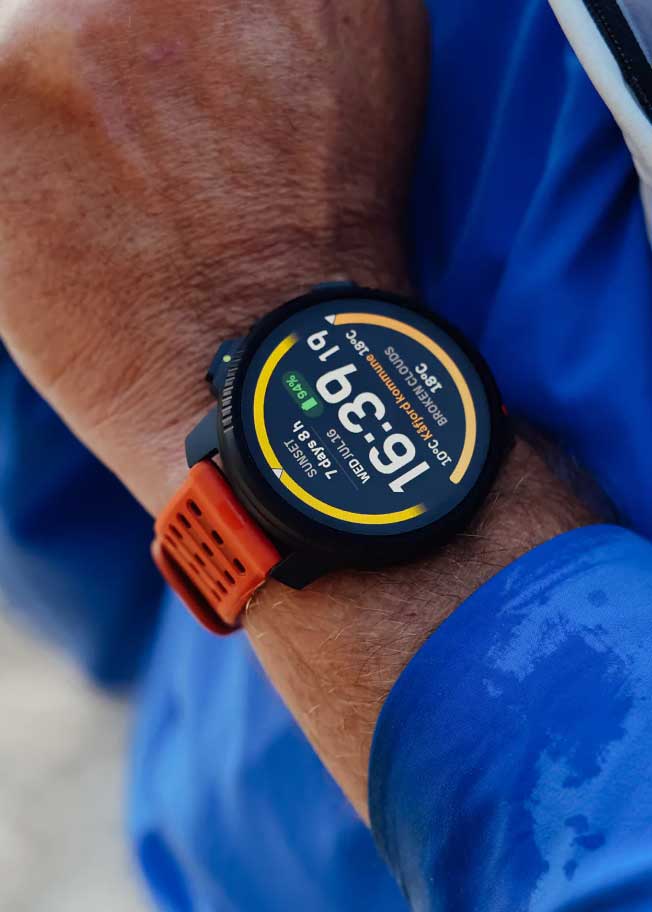 Цветной сенсорный AMOLED циферблат 1,5‘’ с разрешением 466x466. Настраиваемые экраны и подсветка. Дополнительные функции: второй часовой пояс, секундомер, SPLIT-хронограф, таймер, будильник, время восхода/захода солнца, автоматический переход на зимнее и летнее время. Датчики: барометрический альтиметр, электронный компас, термометр, пульсоксиметр (показывает уровень кислорода в крови).
