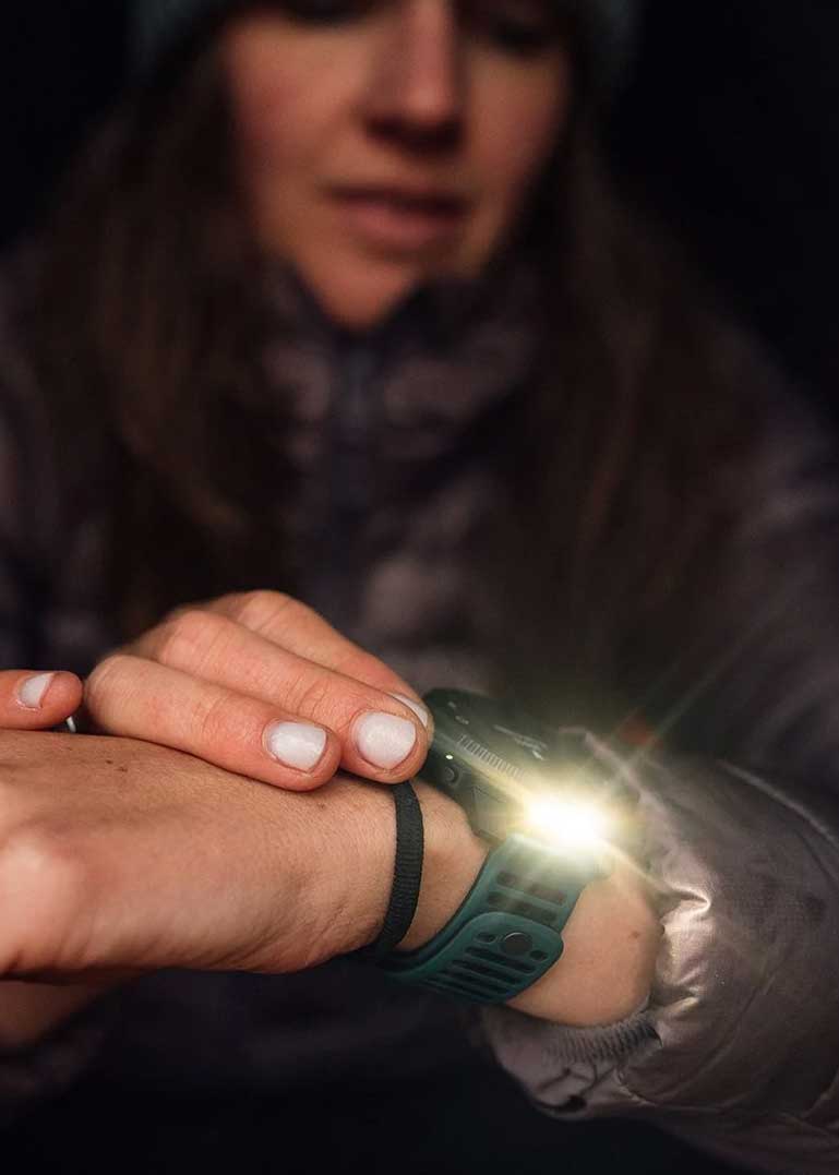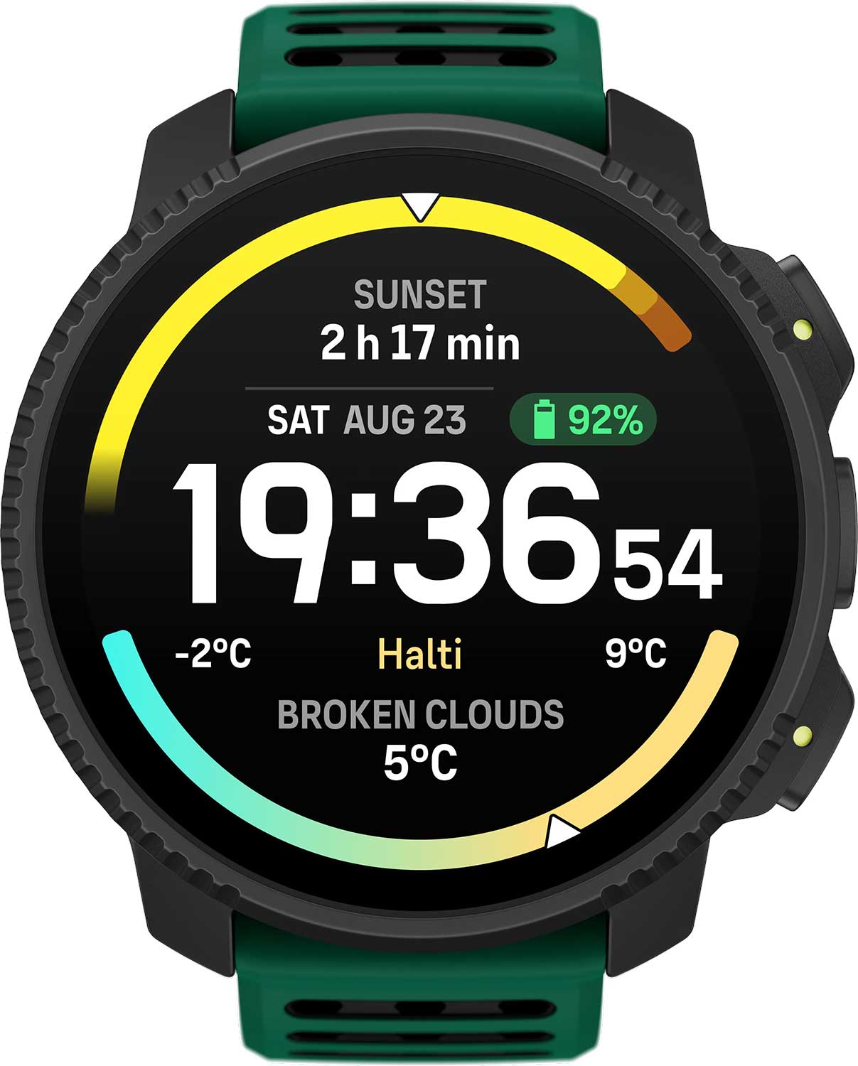 Цветной сенсорный AMOLED циферблат 1,5‘’ с разрешением 466x466. Настраиваемые экраны и подсветка. Дополнительные функции: второй часовой пояс, секундомер, SPLIT-хронограф, таймер, будильник, время восхода/захода солнца, автоматический переход на зимнее и летнее время. Датчики: барометрический альтиметр, электронный компас, термометр, пульсоксиметр (показывает уровень кислорода в крови).