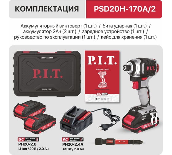 Винтоверт P.I.T. IMPACT аккумуляторный бесщёточный, 20В, 170Нм, 3ск, HEX 1/4, 2х2Ач, ЗУ,кейс PSD20H-170A/2