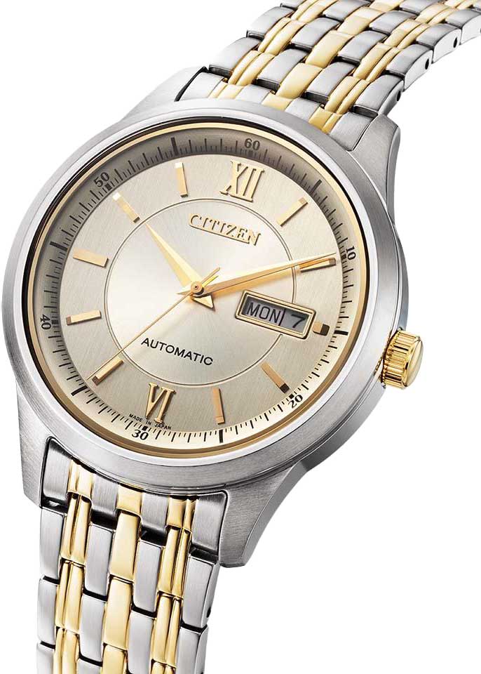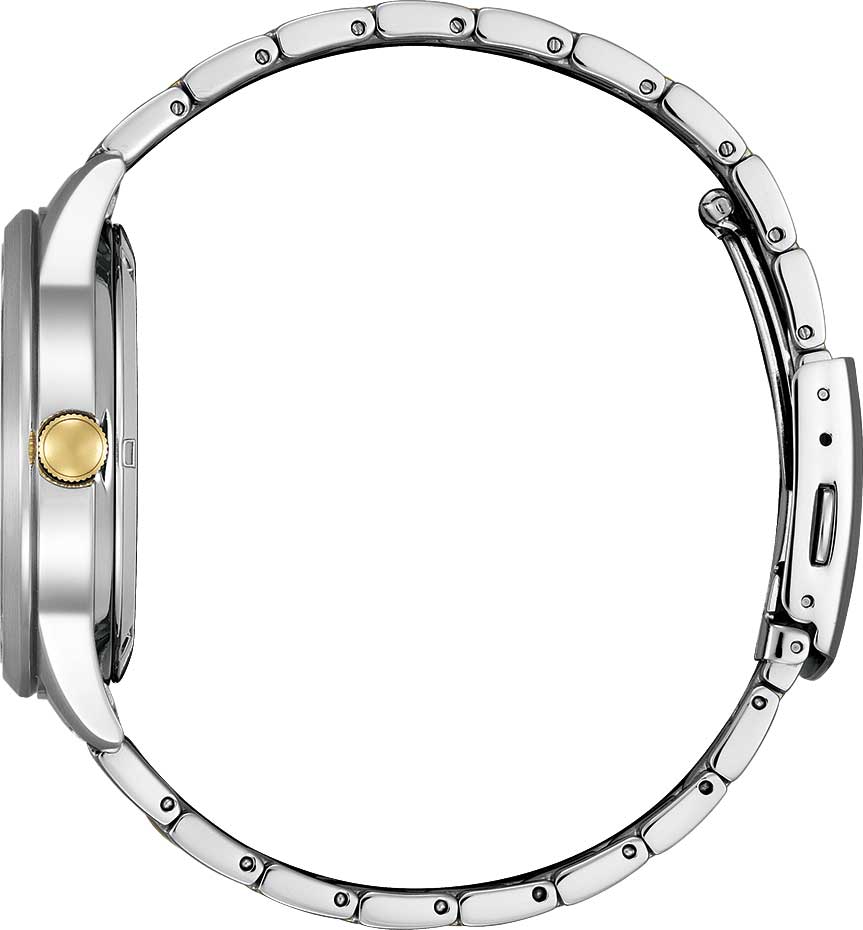 Циферблат выполнен по технологии Sunray (солнечные лучи) и защищен прочным сапфировым стеклом. Метки в виде штрихов и двух римских цифр. Окошко даты и дня недели находится в положении 3 часа. Прозрачная задняя крышка. Браслет с раскладывающейся застежкой.