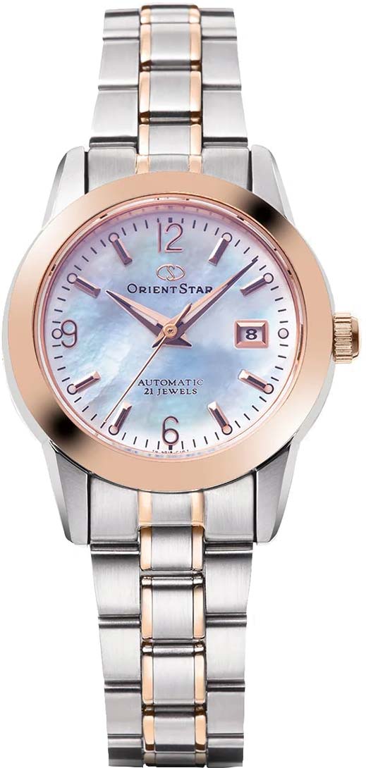 Женские часы. В механизме 21 камень, частота 21600 полуколебаний в час. Запас хода 40 часов. Функция stop-second. Перламутровый циферблат с метками в виде штрихов и цифрами 6,9 и 12. Возможность ручного завода. Окошко даты на отметке 3 часа. Клиновидные стрелки в стиле Dauphine. Рифленая заводная головка. Завинчивающаяся прозрачная задняя крышка с сапфировым стеклом. Браслет с раскладывающейся застежкой.