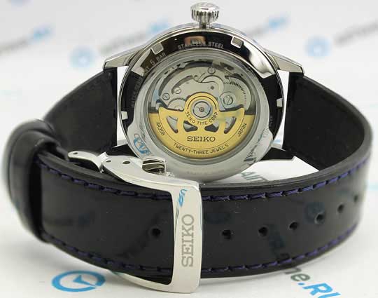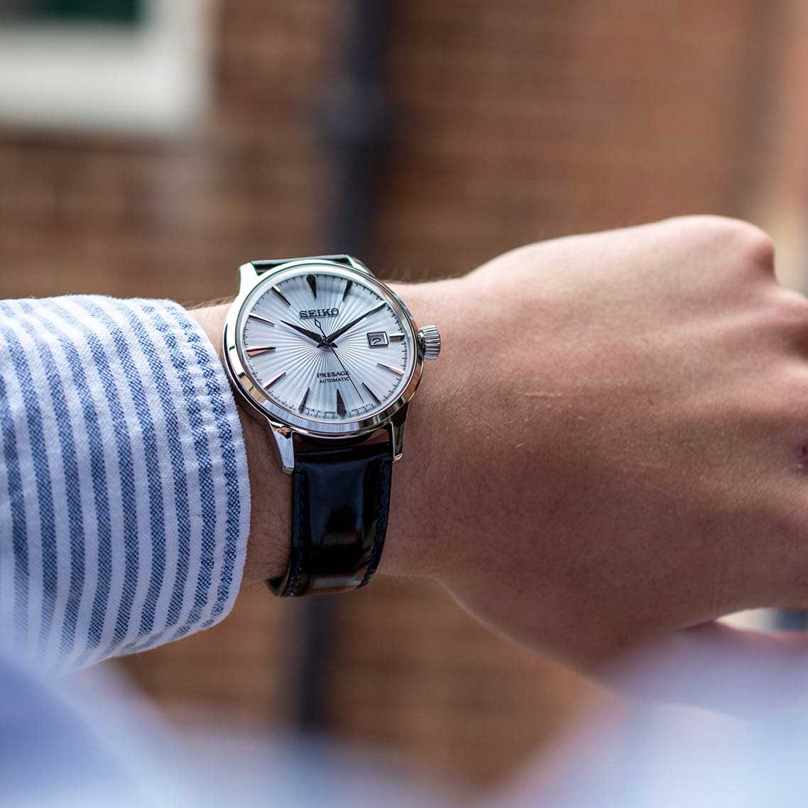 Presage Cocktail Time. Мужские часы. Серия часов вдохновлена японской культурой коктейлей. Секундная стрелка выполнена в виде палочки для перемешивания коктейлей. В механизме 23 камня, частота 21600 полуколебаний в час. Запас хода 41 час. Функция stop-second. Возможность ручного завода. Циферблат с метками в виде штрихов. Окошко даты находится в положении 3 часа. Рифленая заводная головка. Завинчивающаяся прозрачная задняя крышка. Ремешок с раскладывающейся застежкой. Столь насыщенные цвета достигаются благодаря глянцевому лаку, нанесенному в семь слоев на гильошированный циферблат, выполненный в технике «солнечные лучи».
