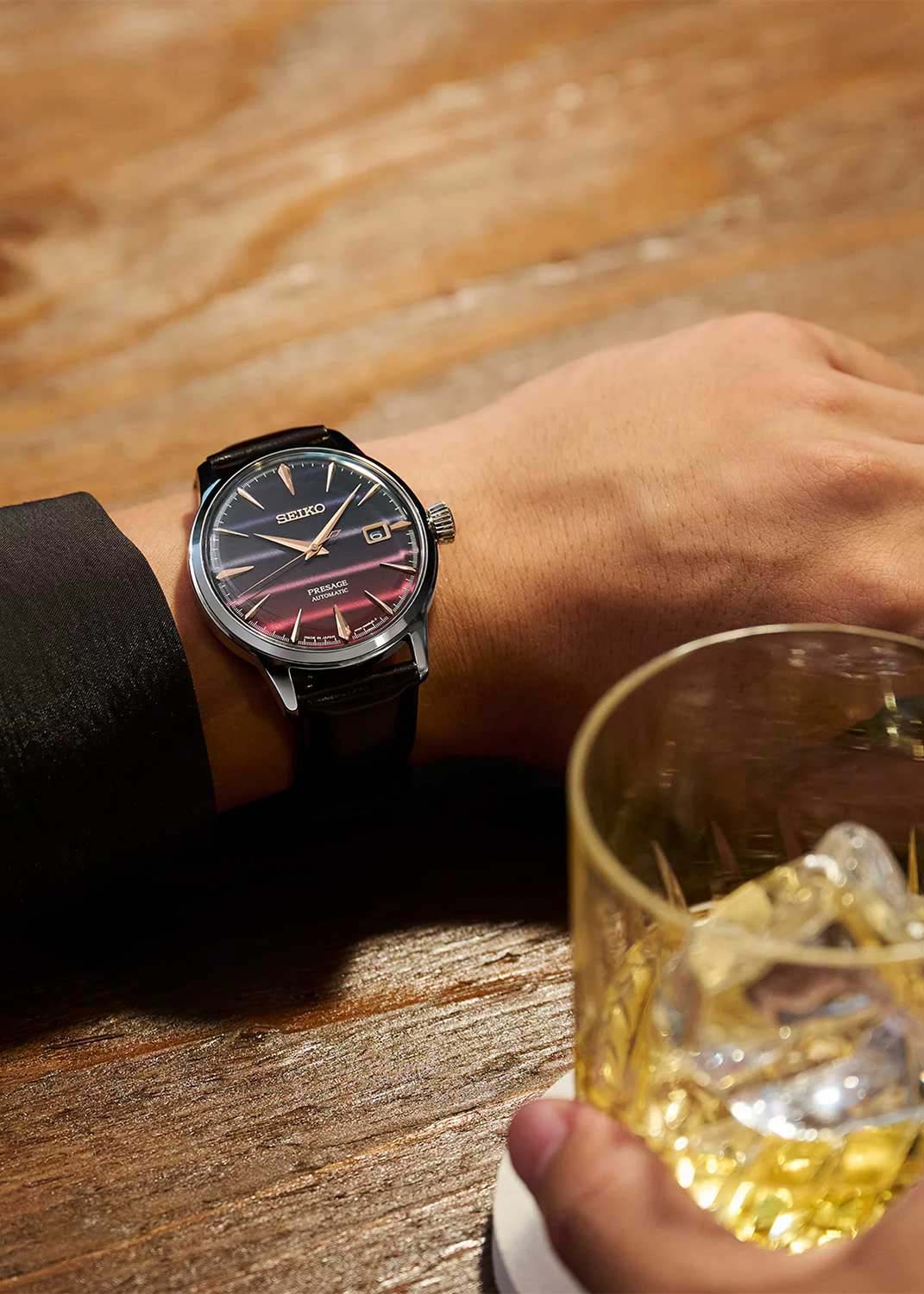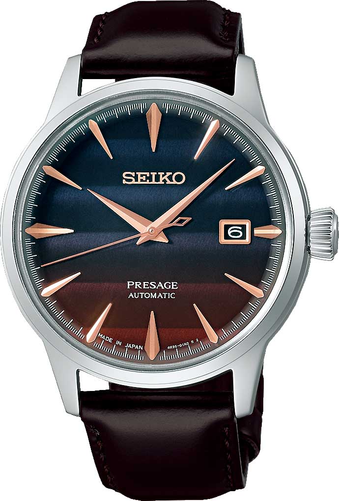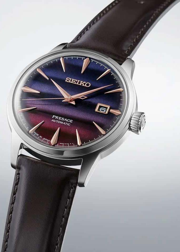 Presage Cocktail Time. Лимитированная серия - 9000 экземпляров. Часы вдохновлены японской культурой коктейлей и другими особыми напитками из бара Star. В этом баре работает знаменитый бармен Хисаши Киши, который специализируется на смешивании японских и международных вкусов. Цветовая гамма часов вдохновлена коктейлем Purple Sunset. Секундная стрелка выполнена в виде палочки для перемешивания коктейлей.