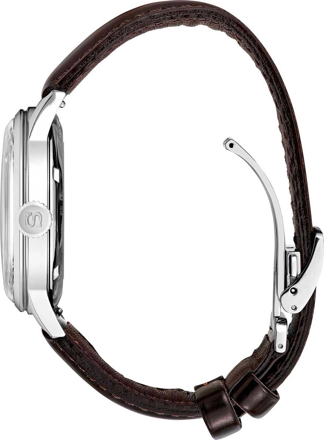 Циферблат с метками в виде штрихов. Окошко даты находится в положении 3 часа. Завинчивающаяся прозрачная задняя крышка. Ремешок с тройной раскладывающейся застежкой и системой быстрой замены.