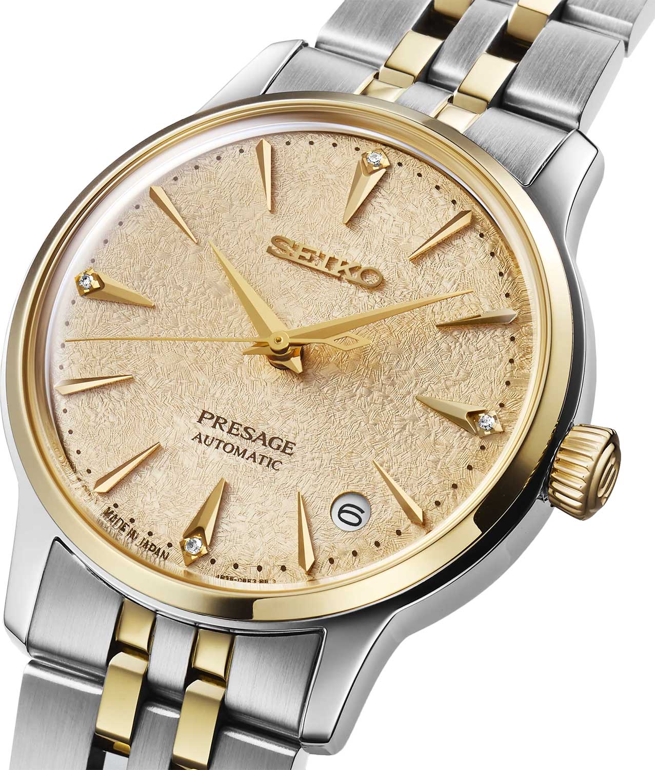 Presage Cocktail Time. Женские часы. Серия часов вдохновлена японской культурой коктейлей, а цветовая гамма данной модели вдохновлена коктейлем Frozen Banana Daiquiri. Секундная стрелка выполнена в виде палочки для перемешивания коктейлей.