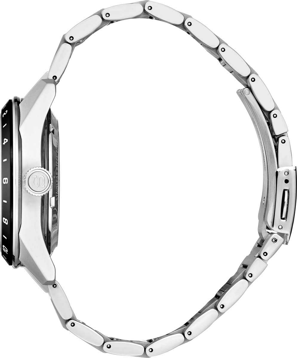 Циферблат с метками в виде штрихов выполнен по технологии Sunray (солнечные лучи). Число вынесено на отдельный циферблат. Завинчивающаяся прозрачная задняя крышка. Стальной браслет с тройной раскладывающейся застежкой.