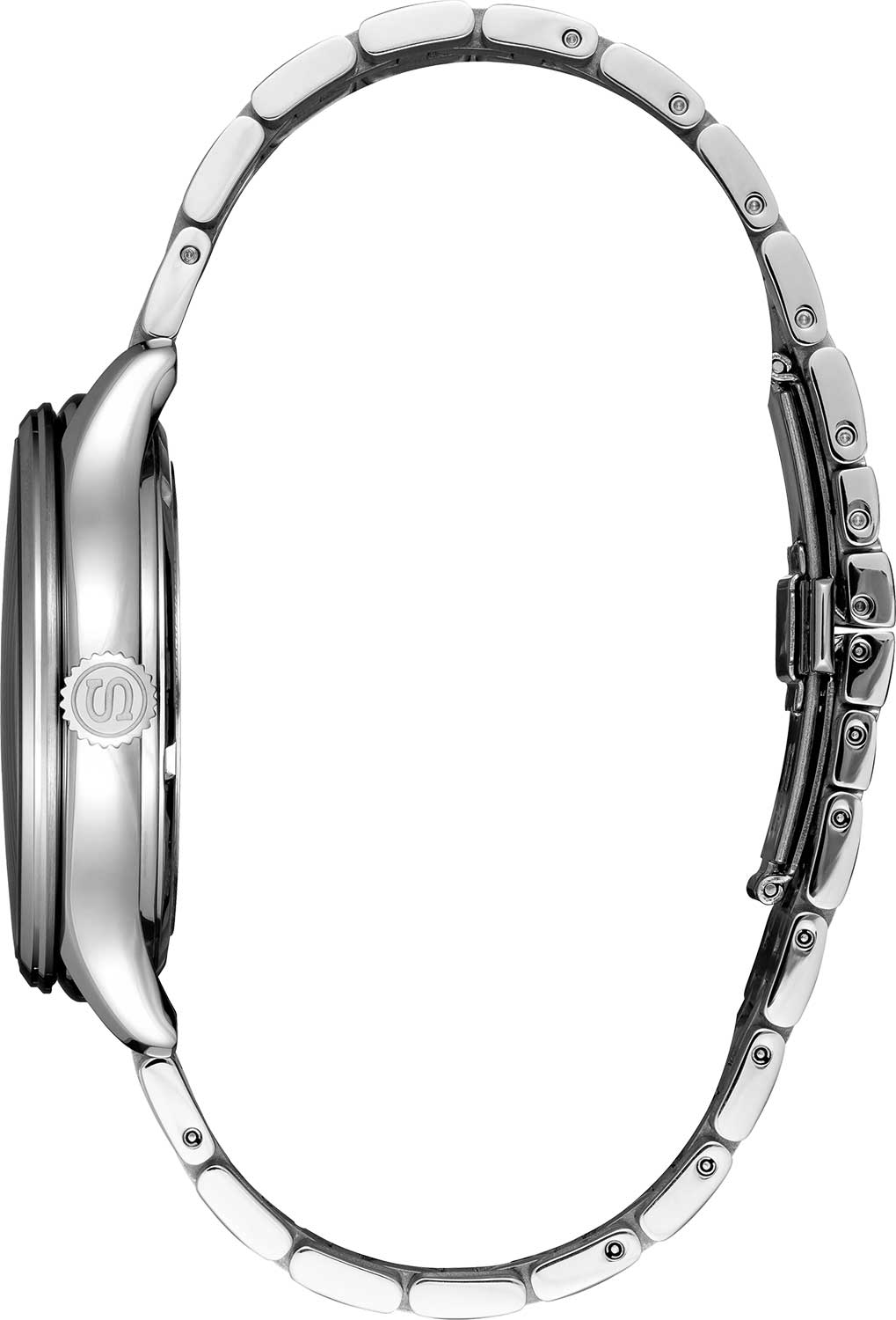 Циферблат с метками в виде штрихов защищен прочным сапфировым стеклом. Окошко даты находится в положении 6 часов. Завинчивающаяся прозрачная задняя крышка. Браслет с раскладывающейся застежкой.