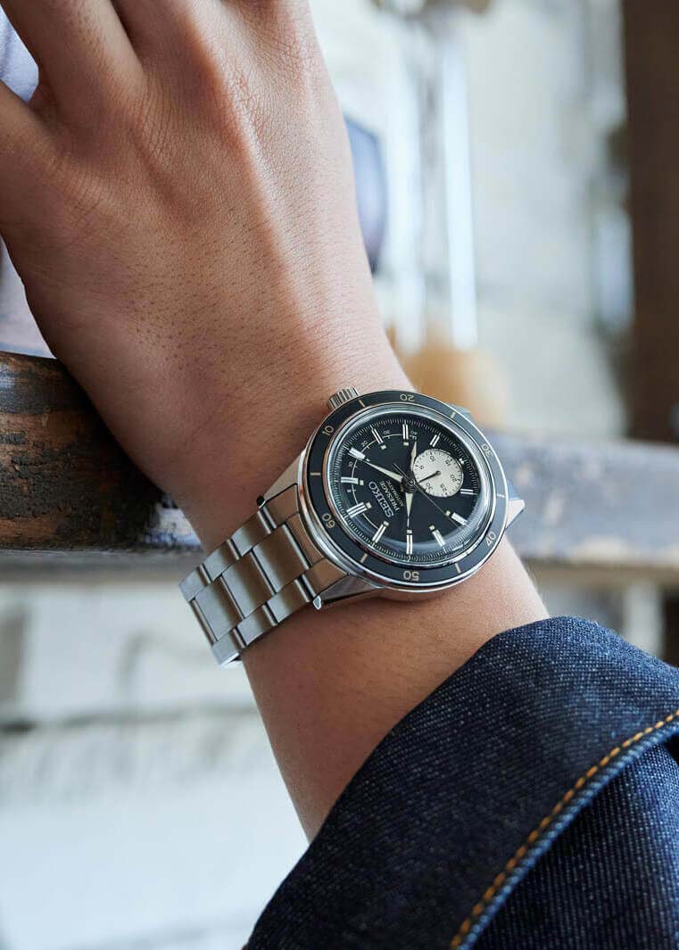 Presage Style60’s. Коллекция вдохновлена стилем 1960-х годов и легендарной моделью Seiko «Crown Chronograph» 1964 года — первых японских часов с функцией секундомера.