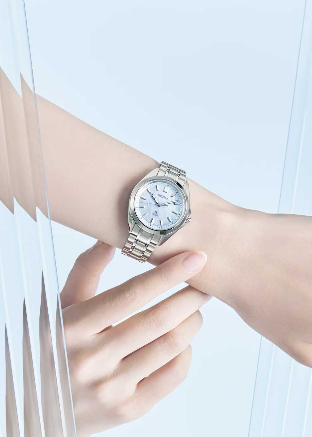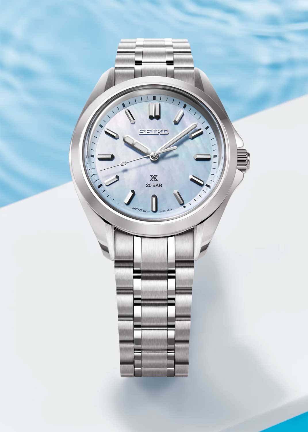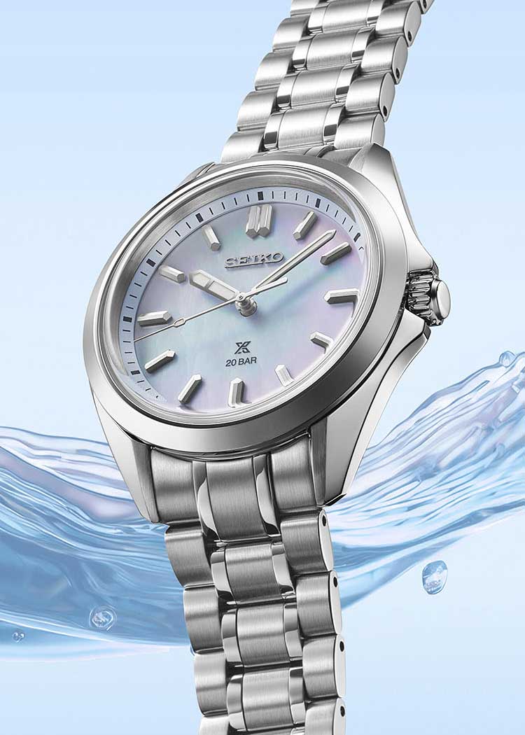 Prospex Sea. Женские часы. Защищены от магнитных полей (до 4800 А/м). Перламутровый циферблат с накладными метками в виде штрихов защищен прочным сапфировым стеклом. Стрелки и метки фирменным люминесцентным покрытием LumiBrite, которое светится в темноте после непродолжительной подзарядки на свету.