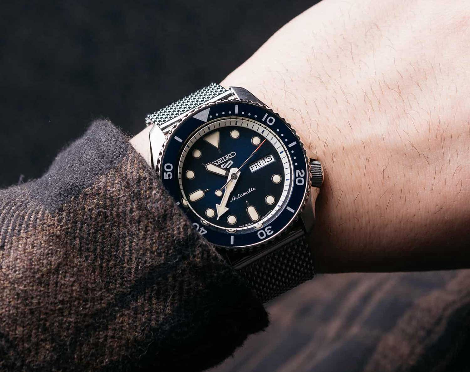 Точные японские часы со спортивными чертами - выбор активных молодых людей. 5 Sports SKX. Мужские часы. В механизме 24 камня, частота 21600 полуколебаний в час. Запас хода 41 час. Окошко даты и дня недели. Функция stop-second. Возможность ручного завода. Защищены от магнитных полей (до 4800 А/м). Циферблат выполнен по технологии Sunray (солнечные лучи). Метки в виде штрихов и точек. Стрелки и метки с фирменным люминесцентным покрытием LumiBrite, которое светится в темноте после непродолжительной подзарядки на свету. Окошко даты и дня недели находится в положении 3 часа. Безель вращается в одном направлении. Завинчивающаяся прозрачная задняя крышка. Заводная головка с защитой расположена в положении 4 часа. Браслет миланского плетения с регулируемой застежкой.