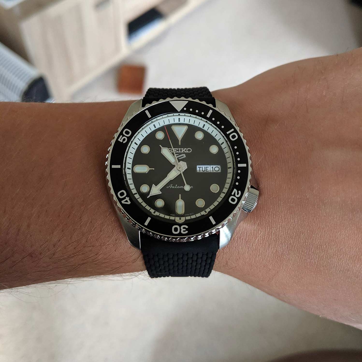 Точные японские часы со спортивными чертами - выбор активных молодых людей. 5 Sports Suits. Мужские часы. В механизме 24 камня, частота 21600 полуколебаний в час. Запас хода 41 час. Окошко даты и дня недели. Функция stop-second. Возможность ручного завода. Циферблат с метками в виде штрихов и точек. Стрелки и метки с фирменным люминесцентным покрытием LumiBrite, которое светится в темноте после непродолжительной подзарядки на свету. Безель вращается в одном направлении. Завинчивающаяся прозрачная задняя крышка. Заводная головка с защитой расположена в положении 4 часа. Ремешок с классической застежкой.