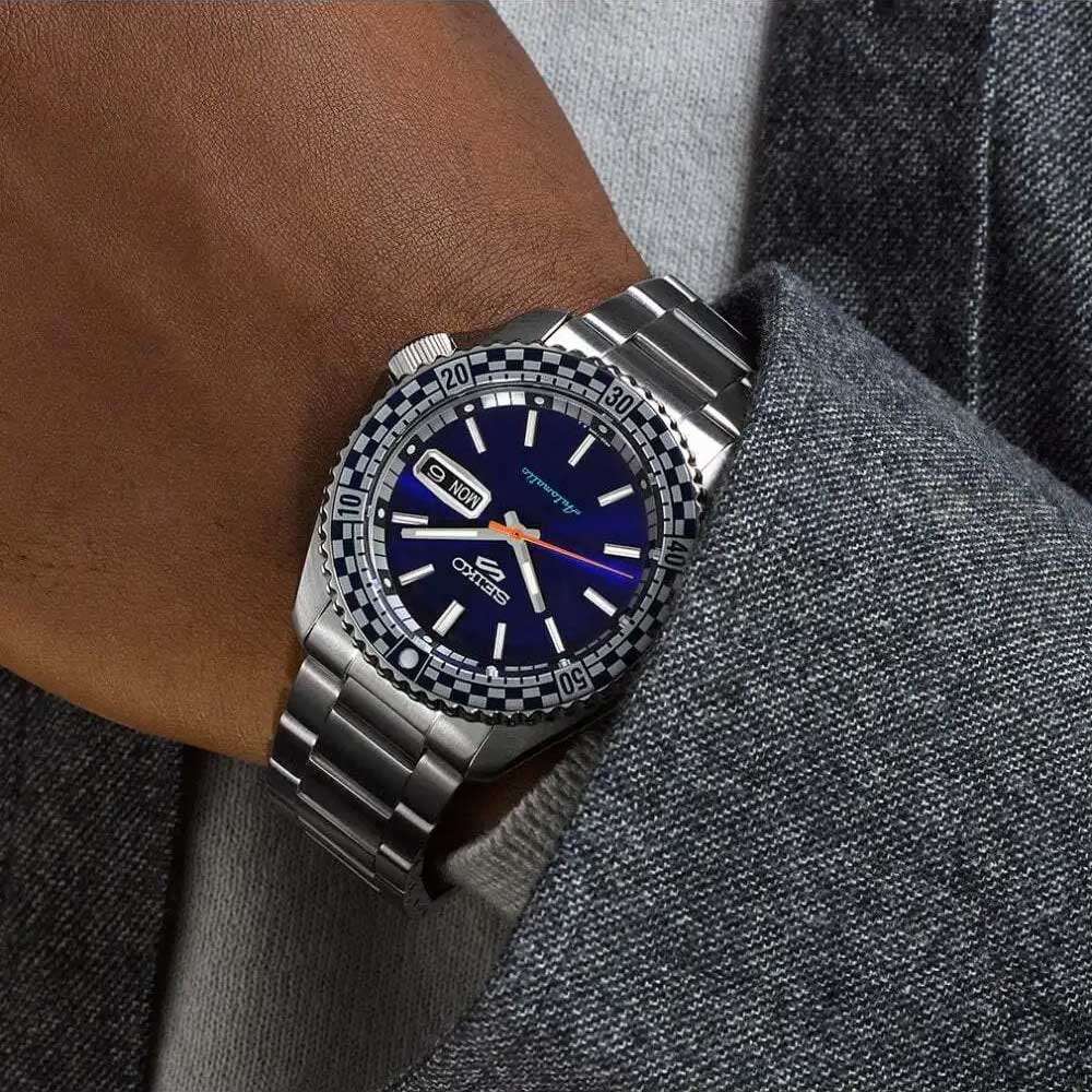 Надежные часы из коллекции 5 Sports в оригинальном корпусе из нержавеющей стали для уверенных в себе мужчин. 5 Sports SKX Checker Flag. Часы вдохновлены винтажными моделями Seiko 5 Sports 1960-х и 1970-х годов. В механизме 24 камня, частота 21600 полуколебаний в час. Запас хода 41 час. Функция stop-second. Возможность ручного завода. Защищены от магнитных полей (до 4800 А/м). Циферблат с метками в виде штрихов выполнен по технологии Sunray (солнечные лучи). Стрелки и метки с фирменным люминесцентным покрытием LumiBrite, которое светится в темноте после непродолжительной подзарядки на свету. Двойное окошко даты и дня недели находится в положении 3 часа. Безель вращается в одном направлении. Рифленая заводная головка с защитой находится в положении 4 часа. Завинчивающаяся прозрачная задняя крышка. Надежный стальной браслет с раскладывающейся застежкой. Застежка с системой блокировки.