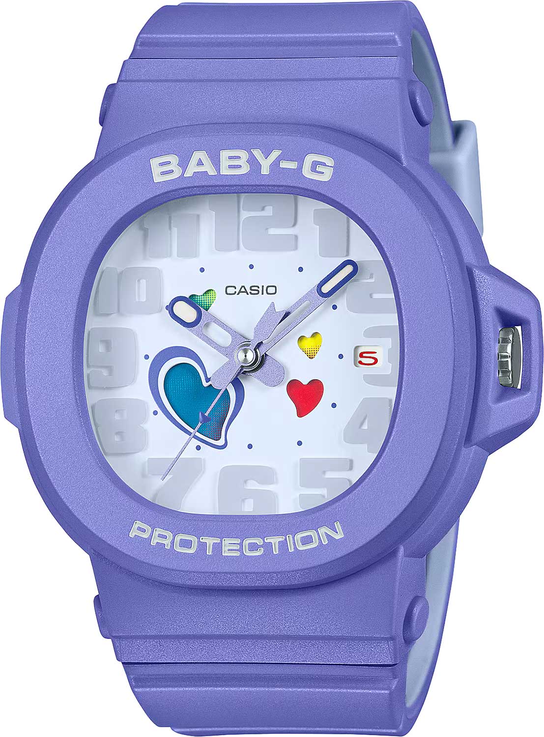 Baby-G. Женские часы. Противоударный корпус защищает механизм от ударов и вибрации. Циферблат с метками в виде арабских цифр. Отверстия на циферблате выполнены в форме сердец и меняют свой цвет каждый день. Окошко даты находится в положении 3 часа. Съемный безель для легкого доступа к заводной головке с защитой. Батарея рассчитана на 3 года. Стальная задняя крышка крепится на 4-х винтах. Ремешок с классической застежкой.
